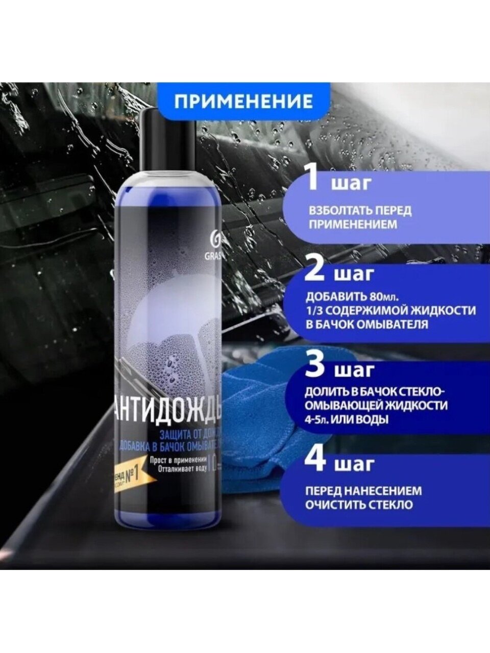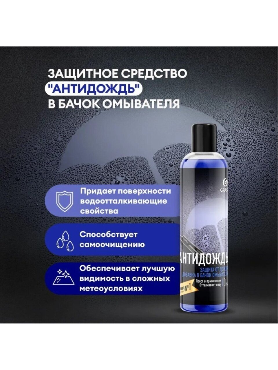 Авто Средство GRASS — это водо - и грязеотталкивающее средство для лобового стекла автомобиля. Заполняет микропоры и микротрещины стекла, образуя невидимую пленку. Дождь и грязь легко скатываются с поверхности, в зимнее время препятствует образованию обледенения. При скорости движения выше 80 км/ч снижается необходимость пользоваться щетками стеклоочистителя. Стекло дольше остается чистым.