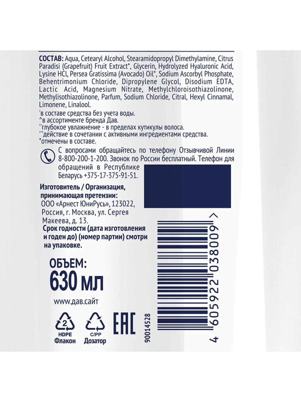 Бренд Dove известен высоким качеством продукции, что обеспечивает уверенность в результате после каждого применения. Бальзам-ополаскиватель помогает поддерживать баланс влаги внутри волос, делая их более послушными и красивыми. Благодаря удобной упаковке объемом 630 мл, средство долго не заканчивается, что особенно удобно для семейного использования и экономии бюджета.