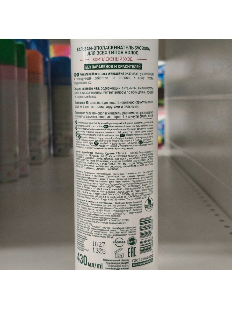 Вы можете приобрести «Бальзам-ополаскиватель для всех типов волос, Svoboda Natural, Женьшень, зеленый чай и провитамин B5, 430 мл» и другие товары в нашем интернет-магазине в Клинцах по низким ценам и с бесплатным самовывозом.