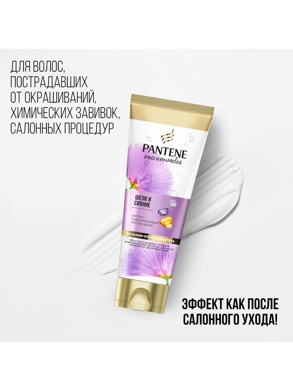Бальзам-ополаскиватель Pantene Pro-v Miracles Шелк и сияние – формула Pro-V с биотином и гидролизованными протеинами шелка интенсивно питает и увлажняет сухие, поврежденные и осветленные волосы. Восстанавливает структуру волос, делает их мягкими и шелковистыми.