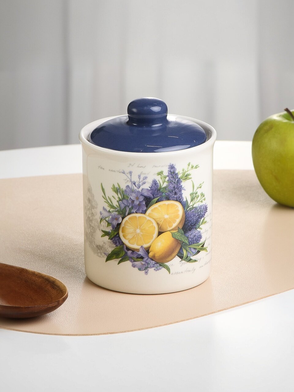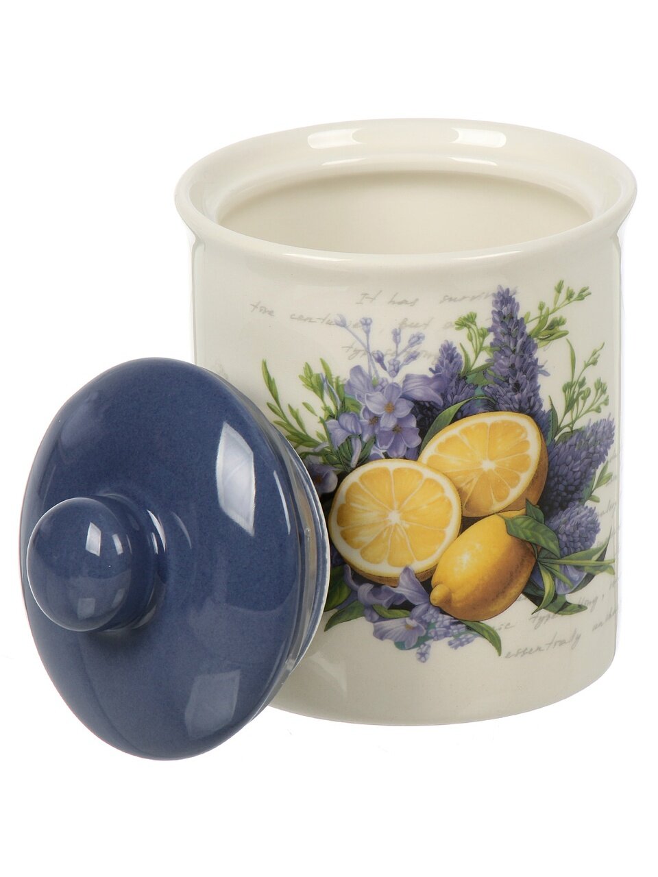 Объём банки — 0.55 литра (округлённо 0.6 л), материал корпуса и крышки — доломит, форма цилиндрическая, крышка герметичная, рисунок лаванды. Высота банки без крышки - 11 см.
