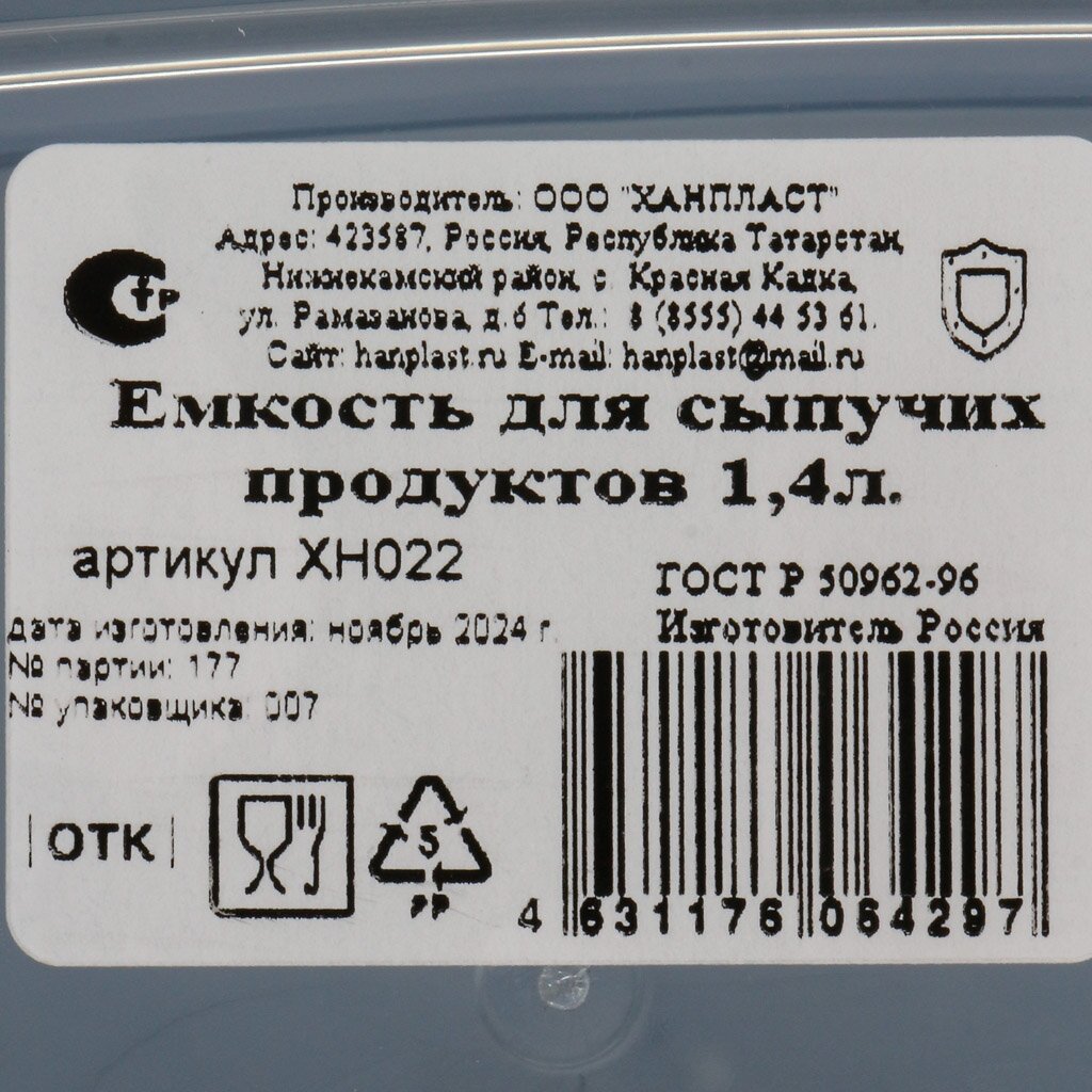 - Оптимальный объём 1.4 л — удобно хранить сахар, крупы, макароны; прочный пластик, подходит для СВЧ и посудомойки