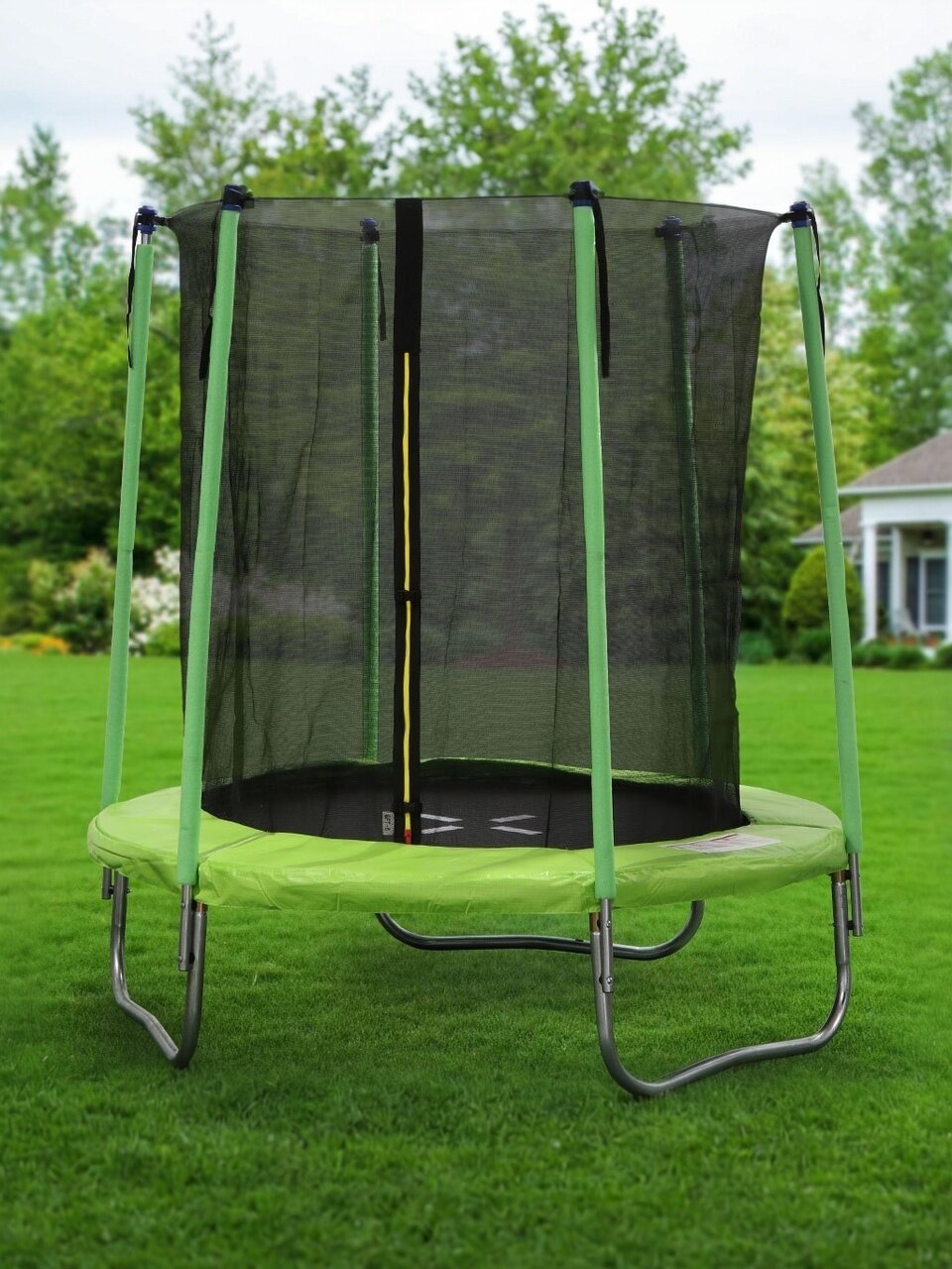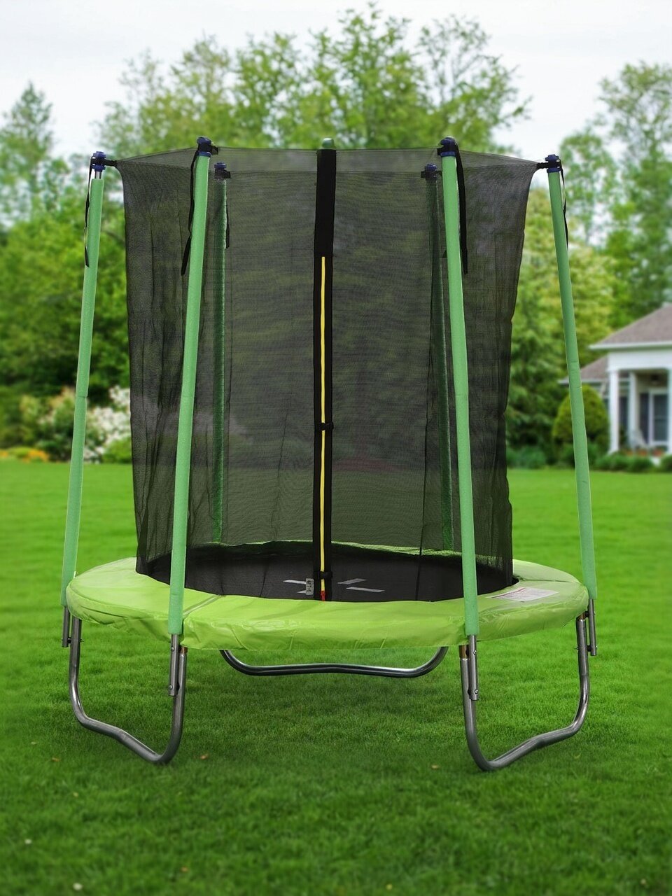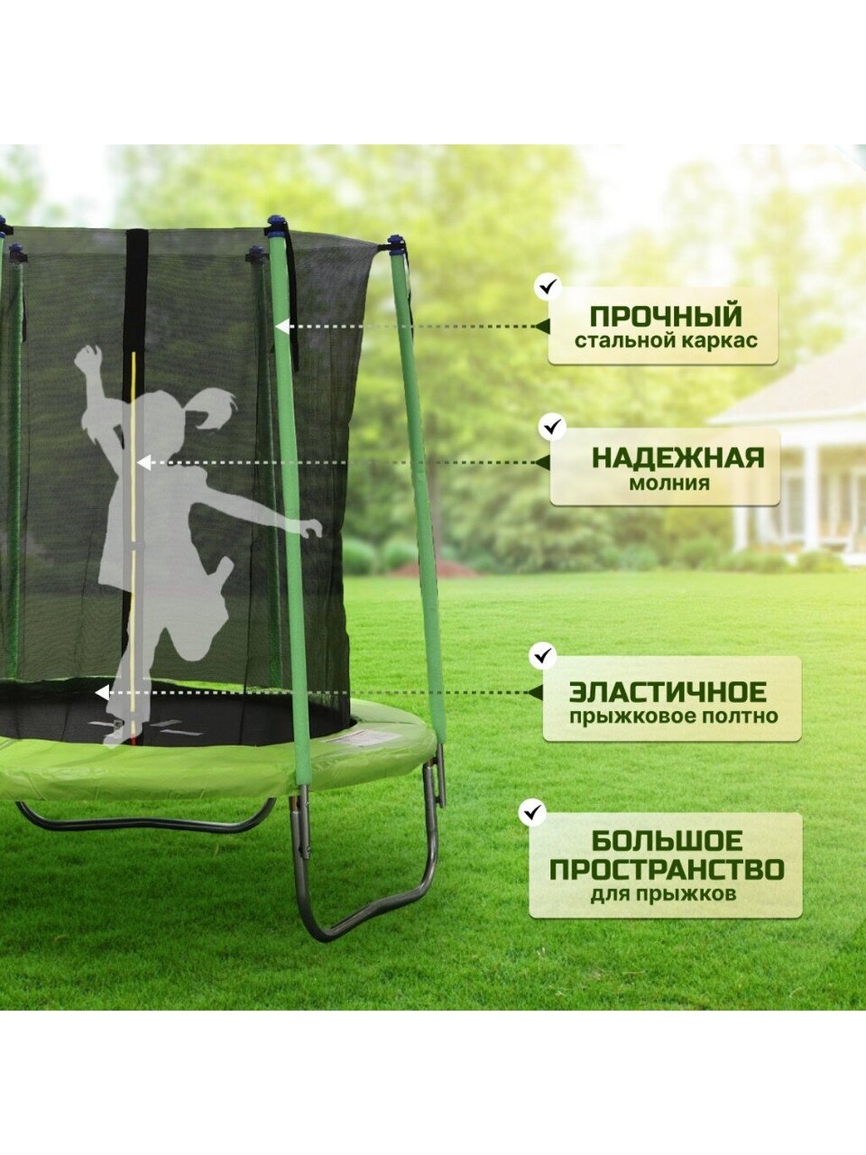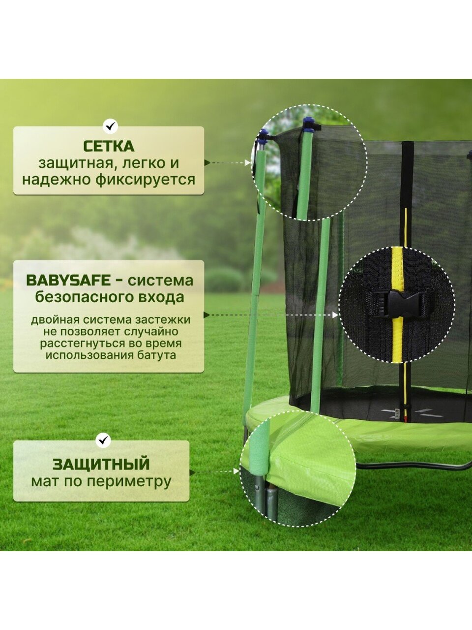 - Безопасность: защитная внутренняя сеть исключает падение с высоты, 3-слойный мат - соприкосновение с пружинным механизмом, двойная молния с фиксатором входа.