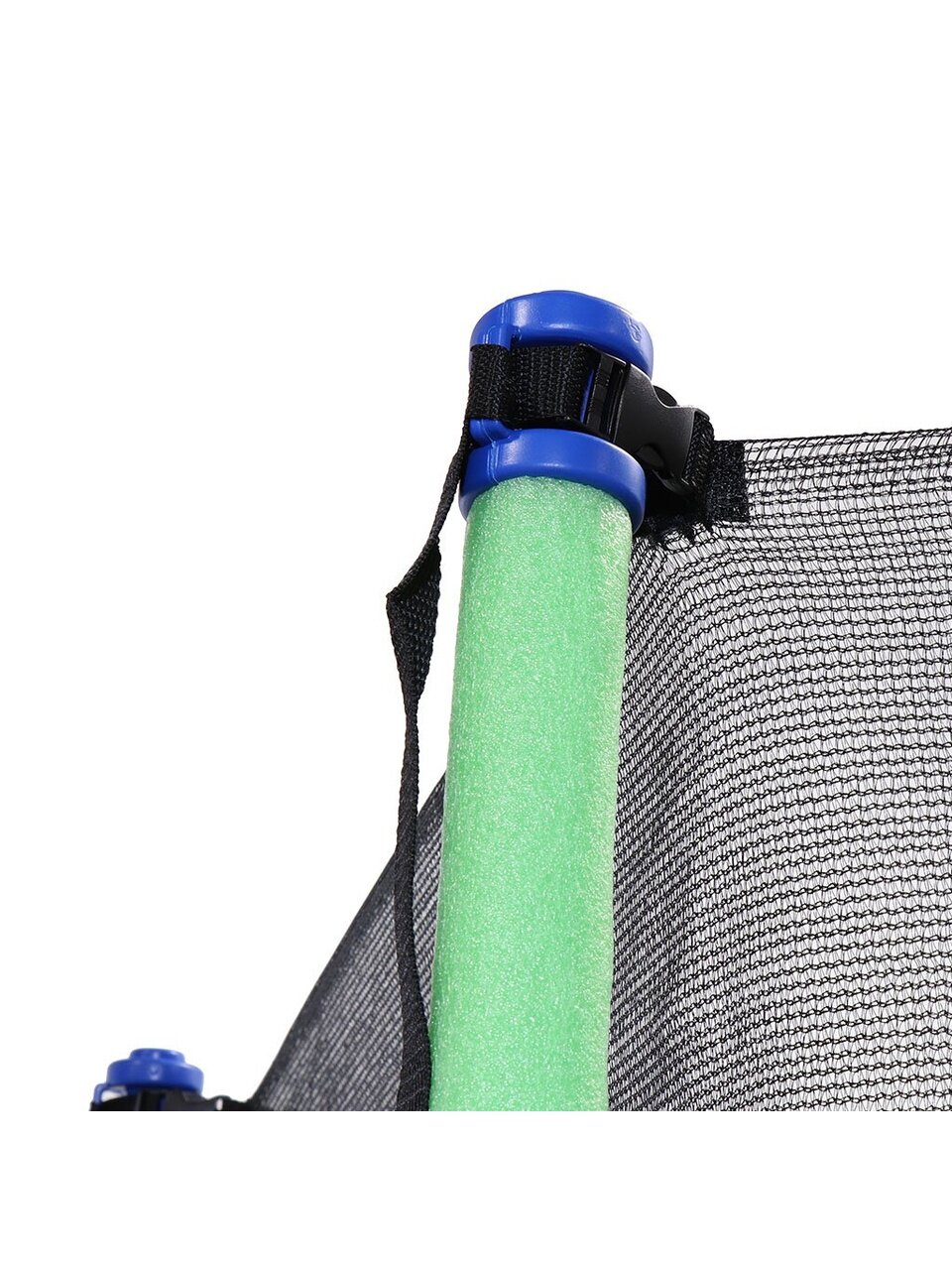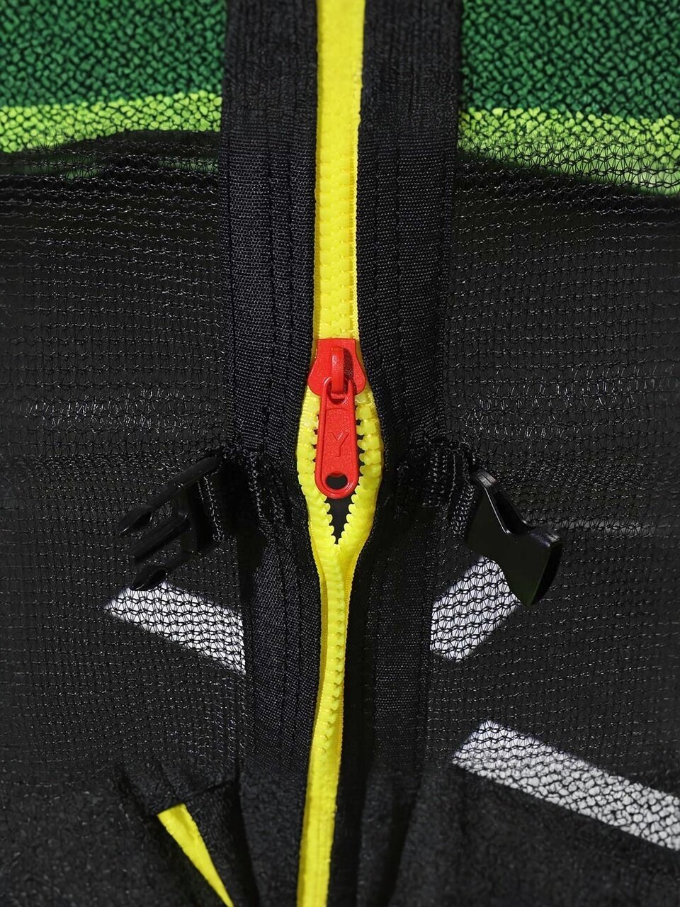 Защитная сеть входит в обязательную комплектацию батутов. Сетка батута устойчива к УФ. Инновационное крепление увеличивает рабочее пространство батута, исключает соприкосновение с пружинным механизмом, все элементы крепления закрыты мягким матом или выполнены из безопасных материалов. Вход на усиленной молнии, оборудован дополнительными фиксаторами, защищен от случайного открывания.