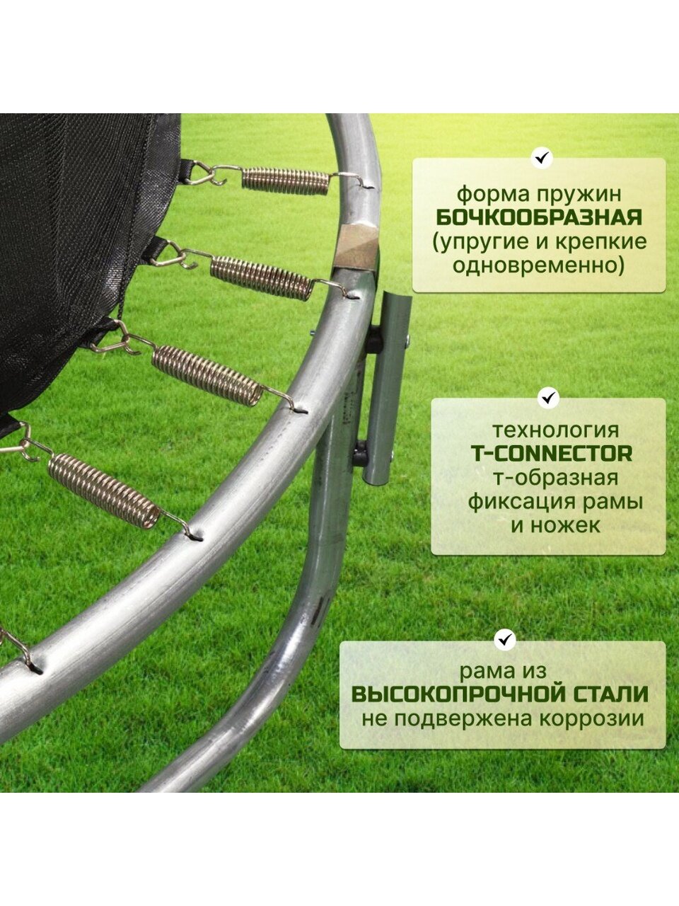 Батуты предназначены не только для детских игр, но и для фитнеса. Благодаря инновационной системе крепления защитной сети значительно увеличено рабочее пространство и безопасность конструкции. Тренировки на батуте — это отличная аэробная нагрузка: улучшения общей физической формы, заряд положительными эмоциями, улучшение работы кардиоваскулярной системы, развитие чувства равновесия и координации в пространстве для пользователей любого возраста. Занятия на свежем воздухе укрепляют иммунитет, снабжают организм кислородом, повышают выносливость как у детей, так и у взрослых. Именно поэтому используются высококачественные комплектующие с большим запасом прочности. В большинстве случаев каркасные батуты устанавливаются под открытым небом, обязательные требования к материалам — это влагостойкость, термоустойчивость, в том числе и к низким температурам, переносимость ультрафиолетовых лучей и износостойкость.
