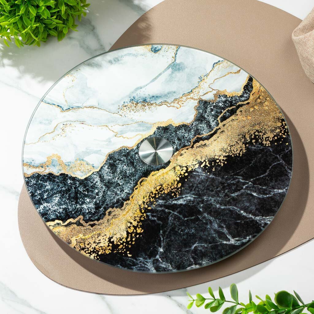Блюдо из коллекции Daniks Флюид черный изготовлено из высококачественного стекла с уникальным мраморным рисунком. Оно идеально подходит для сервировки и станет отличным помощником на любой вечеринке или семейном ужине. Приятный черный цвет придает изделию современный и утонченный вид, который будет гармонировать с любым стилем интерьера. Вращающаяся конструкция позволяет легко и удобно подавать блюда, не вставая с места.