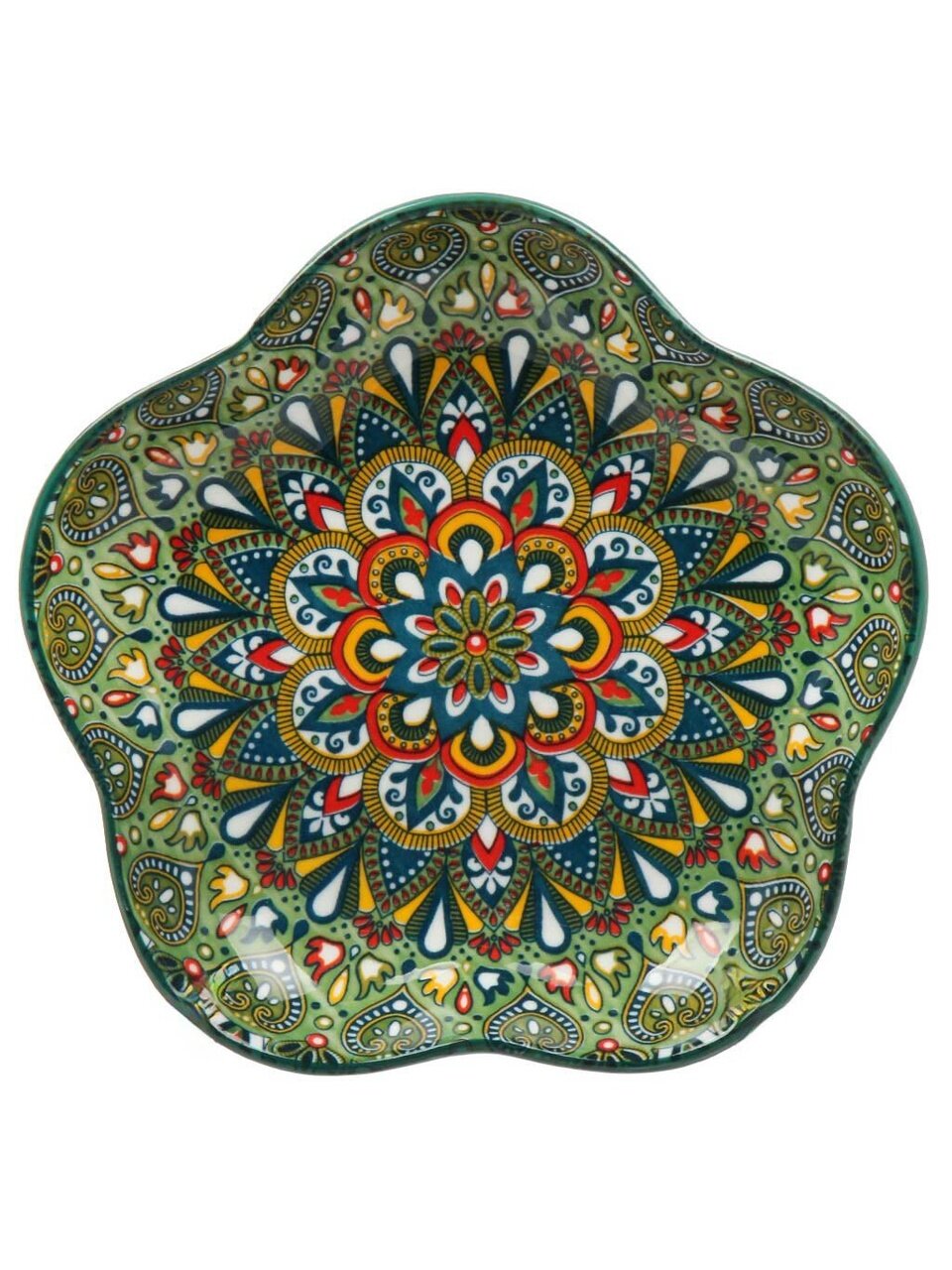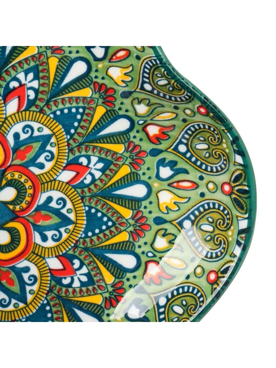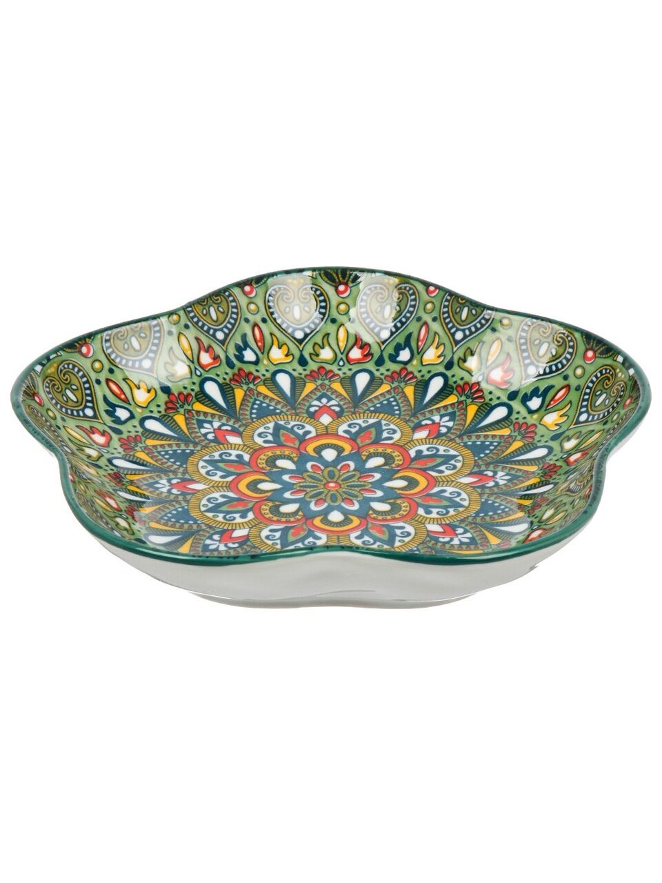 Диаметр блюда — 20 см, материал — керамика, фигурная форма, зеленый цвет с абстрактным рисунком. Можно мыть в посудомоечной машине и использовать в микроволновке.