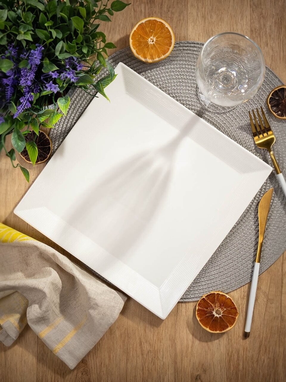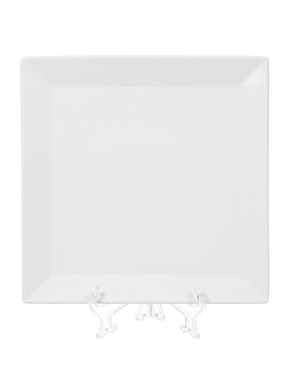 Блюдо квадратное, диаметр 25 см, выполнено из прочной белой керамики, без рисунка, с бортиками, подходит для микроволновки.