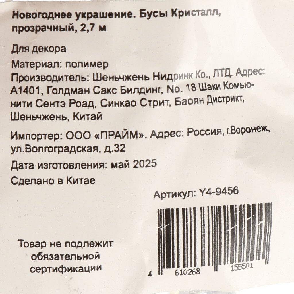 Бусы Кристалл, прозрачные, 2,7 м Y4-9456 — создайте атмосферу уюта и стиля: эффектное украшение для декора интерьера, праздников и фотозон по доступной цене.