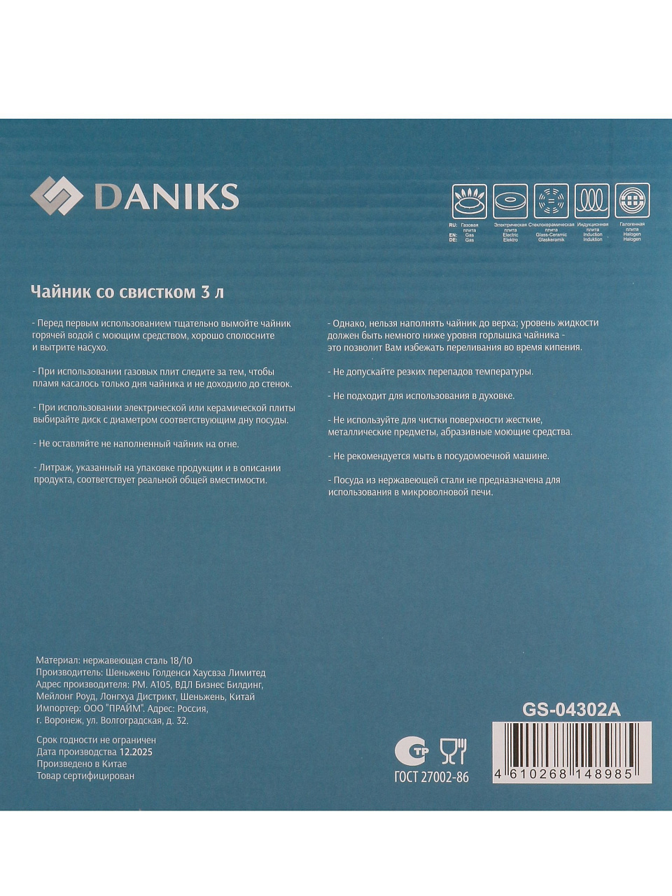 Чайник нерж, 3 л, со свист, нержавеющая сталь, Daniks, GS-04302A
