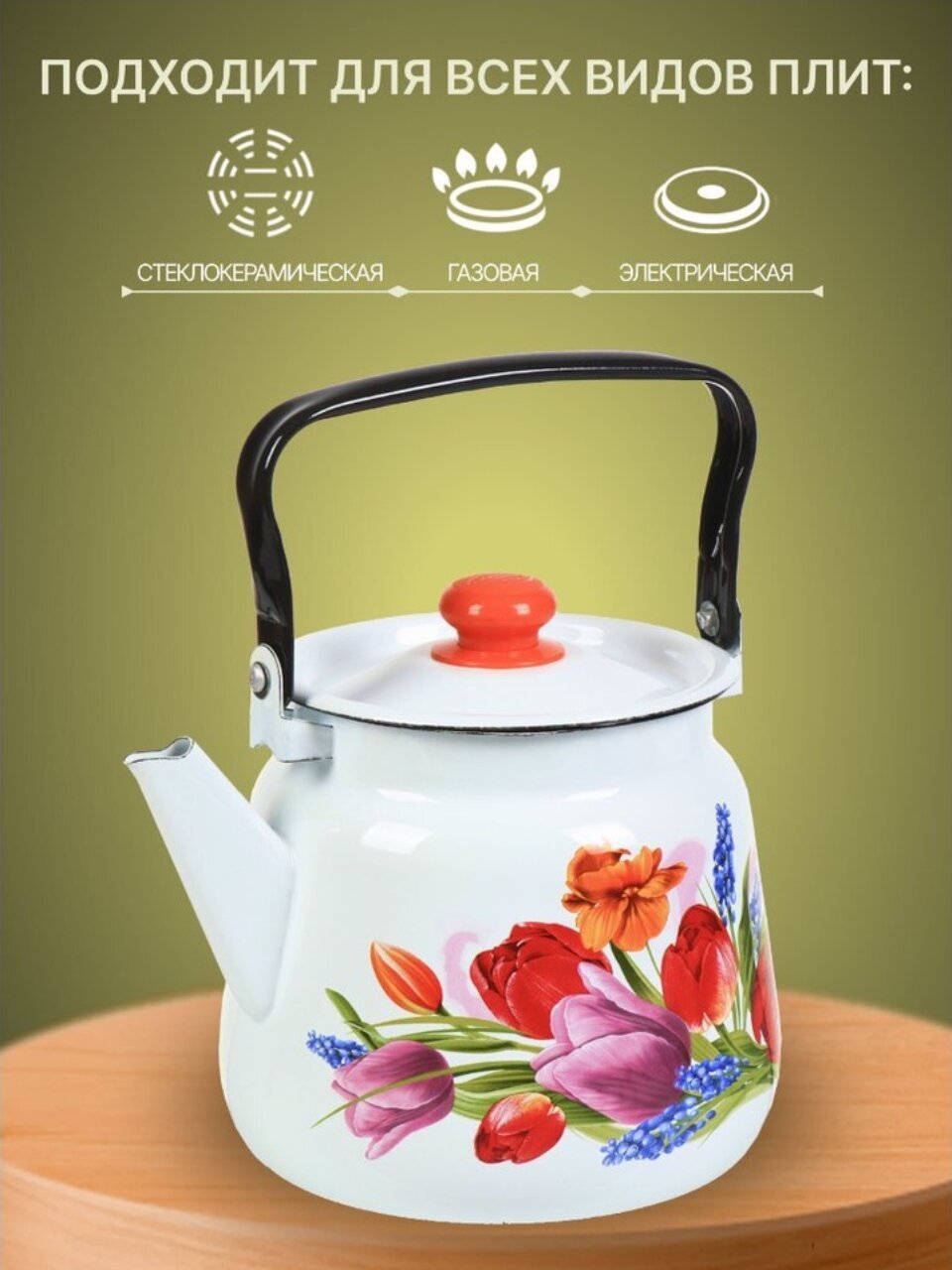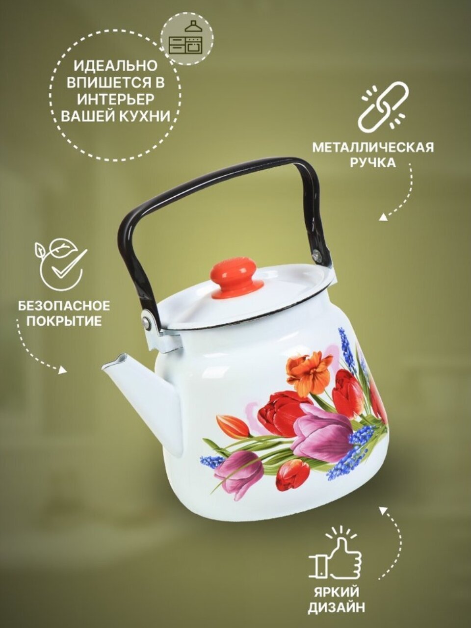 Чайник стальной эмалированный 3.5 л Сибирские товары Тюльпан Май — это оптимальное решение для тех, кто ищет недорогой и практичный чайник для дома, дачи или офиса. Эмалированное покрытие защищает корпус от ржавчины, не впитывает запахи и легко очищается, что особенно важно при интенсивном использовании. Благодаря объему 3.5 литра чайник подойдет для большой семьи или компании.