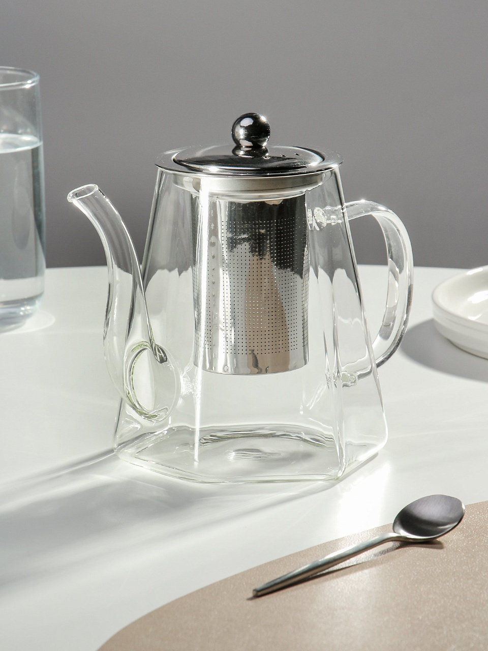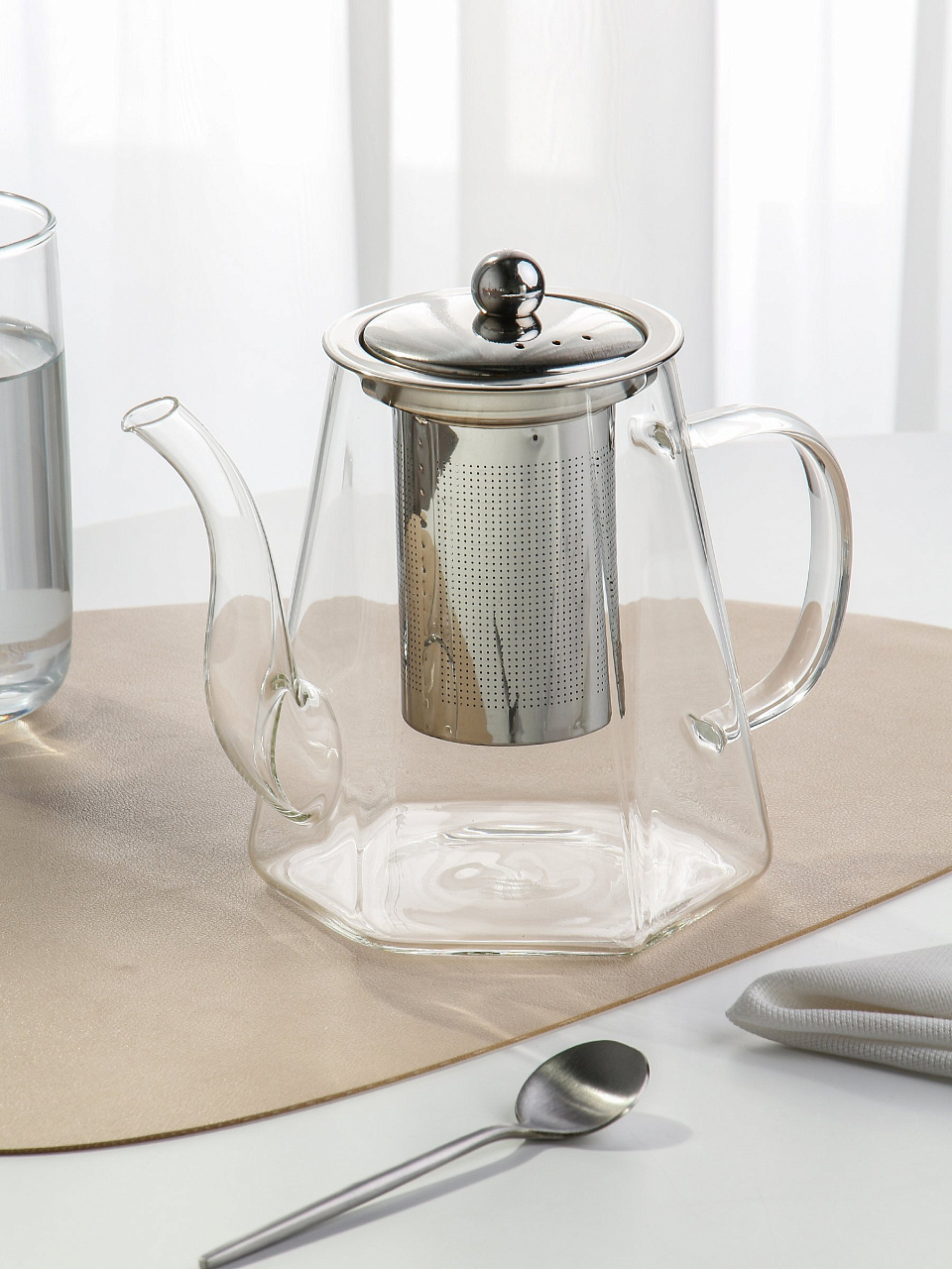 Чайник выполнен из прочного стекла и металла, что обеспечивает долговечность и эстетическую привлекательность. Прозрачный корпус позволяет наблюдать за процессом заваривания, создавая атмосферу уюта и расслабления. Встроенное ситечко делает заваривание чая простым и удобным, позволяя наслаждаться чистым вкусом без лишних чаинок.
