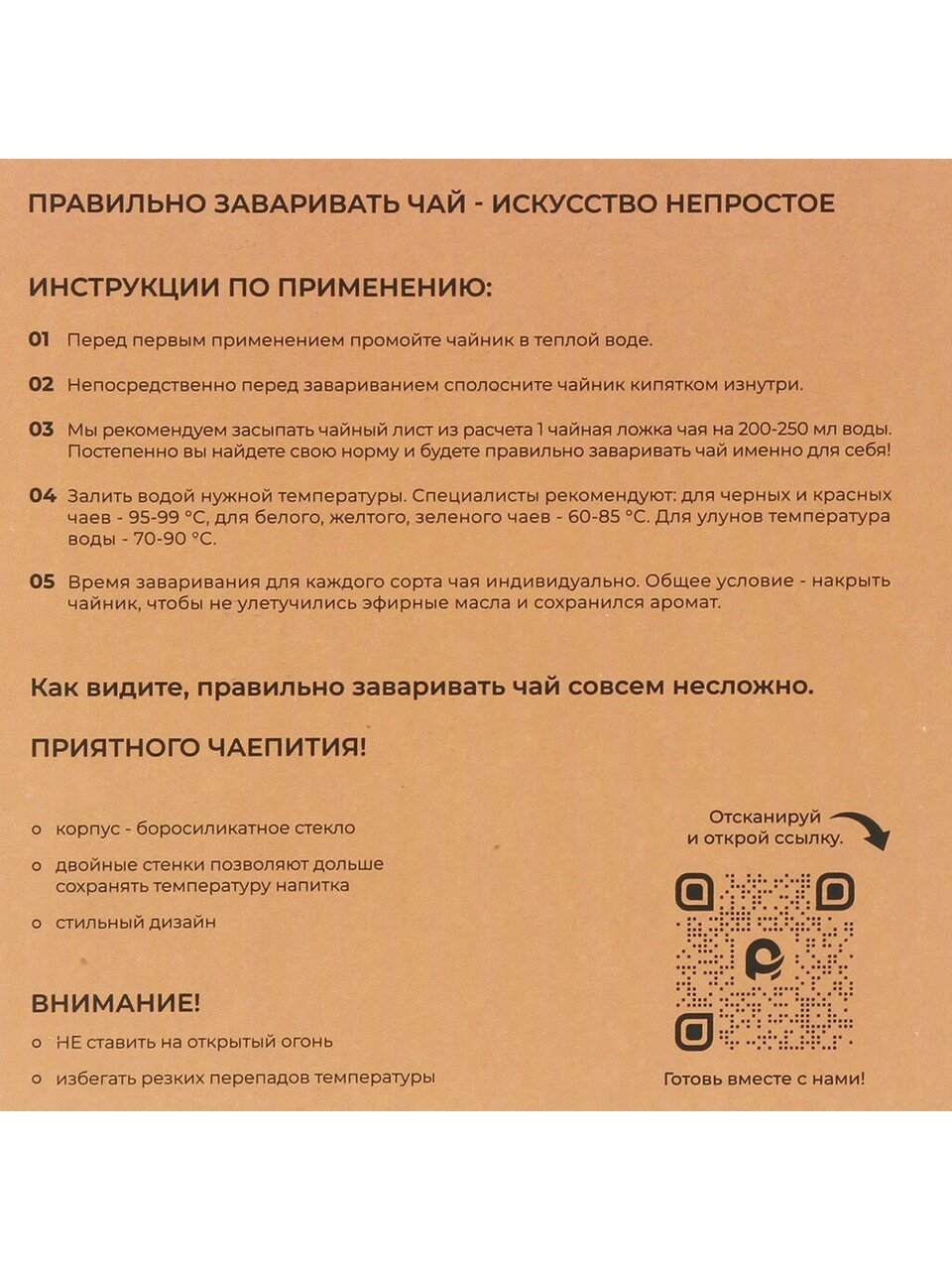 Размеры чайника тщательно продуманы: длина — 13 см, ширина — 8.5 см, высота — 11 см. Компактность и вместительность обеспечивают удобство использования как для одной персоны, так и для небольшой компании. Крышка, ручка и корпус выполнены из прочного стекла, что гарантирует долговечность и легкость ухода. Чайник не имеет ситечка, что позволяет экспериментировать с крупнолистовыми сортами чая и травяными сборами, раскрывая их вкус и аромат на максимум.