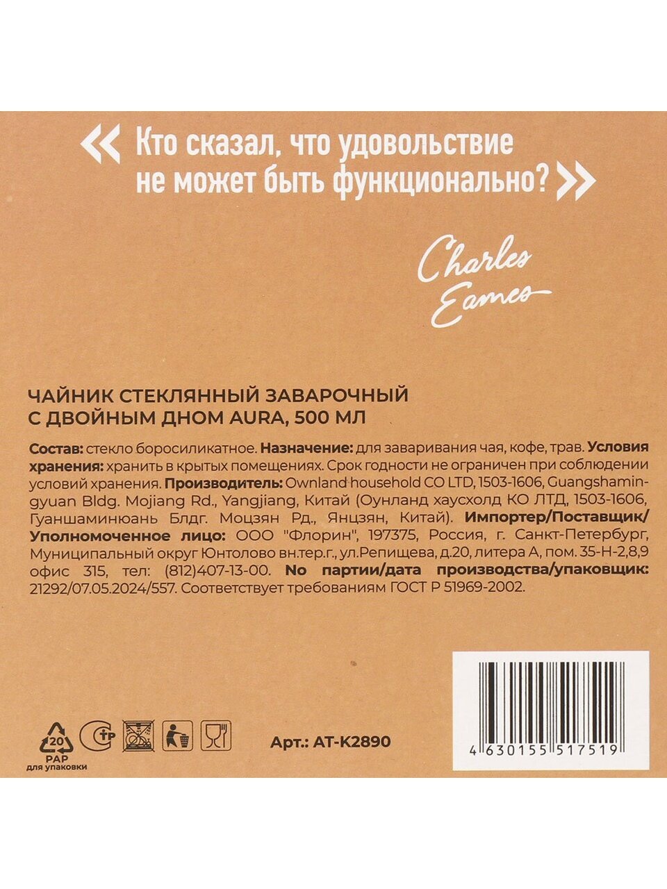 Покупка заварочного чайника Atmosphere Aura AT-K2890 — это выгодное вложение в комфорт и эстетику домашнего чаепития. Такой аксессуар станет незаменимым помощником на кухне, подчеркнет индивидуальность пространства и подарит минуты наслаждения любимым напитком. Высокое качество материалов и современный дизайн обеспечивают долгий срок службы и безупречный внешний вид даже при активном использовании. Оцените удобство, стиль и надежность в одном изделии!