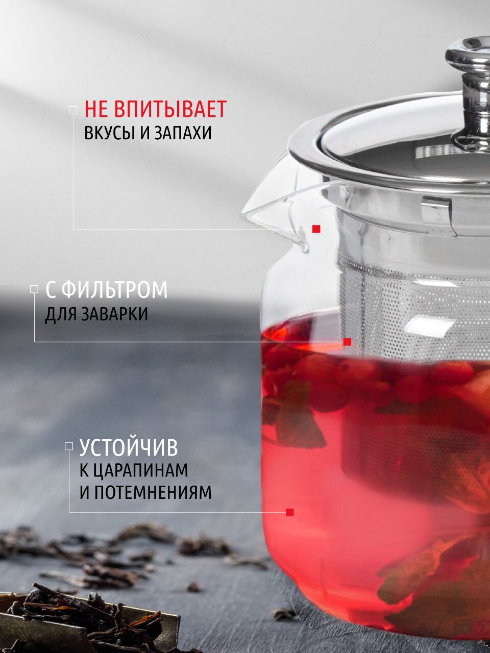 Чайник заварочный можно использовать для заваривания как чая, так и различных травяных настоев, а удобная крышка поддержит нужную температуру. Изделие изготовлено по современной технологии из высокопрочного стекла. Материал чайника отличается износоустойчивостью и легкостью, не впитывает запахи, прост в использовании и мойке. Сетчатый фильтр не позволит чаинкам или мелким частям отвара попасть в напиток. Прозрачный корпус позволяет контролировать процесс заваривания, чтобы получить напиток желаемой крепости.