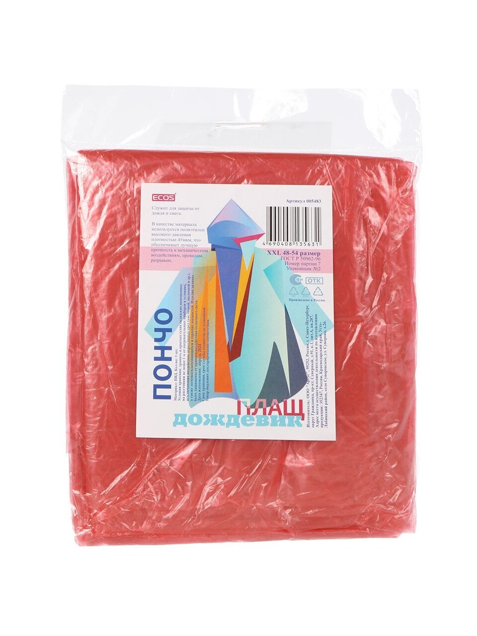 Дождевик-пончо Ecos XXL (р. 48-54, красный, ПВД): надежная защита от дождя на даче, в городе и в путешествиях. Лёгкий, компактный, выгодная цена.
