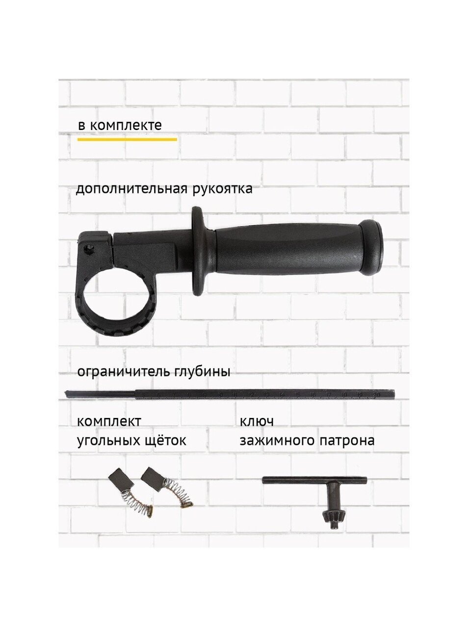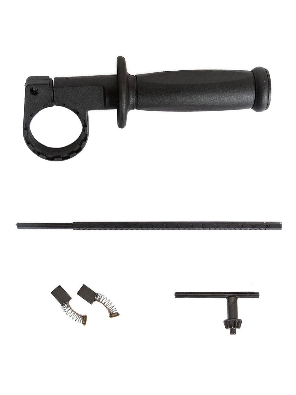 - Полная комплектация: дрель, дополнительная рукоятка, ограничитель глубины сверления, ключ зажимного патрона дрели, запасные угольные щетки электродвигателя, чемодан для хранения и переноски, руководство по эксплуатации, гарантийный талон.