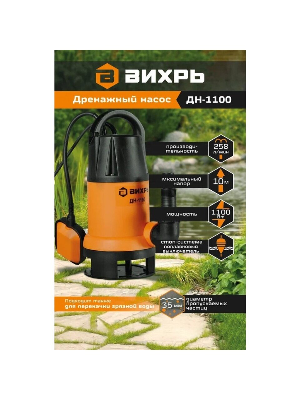 Дренажный насос Вихрь ДН-1100 предназначен для откачивания и отведениия воды и стоков с инородными примесями из различных водоёмов и резервуаров (котлованов, шахт, сливных ям и т.д). С их помощью можно выкачивать воду в случае подтопления жилых помещений и подвалов. Электродвигатель насоса асинхронный, однофазный с короткозамкнутым ротором. Максимальная глубина всасывания составляет не более 8 метров. Температура перекачиваемой жидкости должна быть от +1°С до +35°С. Не допускается работа дренажного насоса "в сухую" (без воды), попадание воздуха во всасывающую магистраль. От перегрузки насос защищает термопротектор, отключение происходит автоматически. При временной установке рекомендуются гибкие трубы, для постоянной установки рекомендуются жесткие трубы. Отличие модели ДН-1100 от ДН-1100Н в том, что корпус у ДН-1100 изготовлен из прочного пластика.