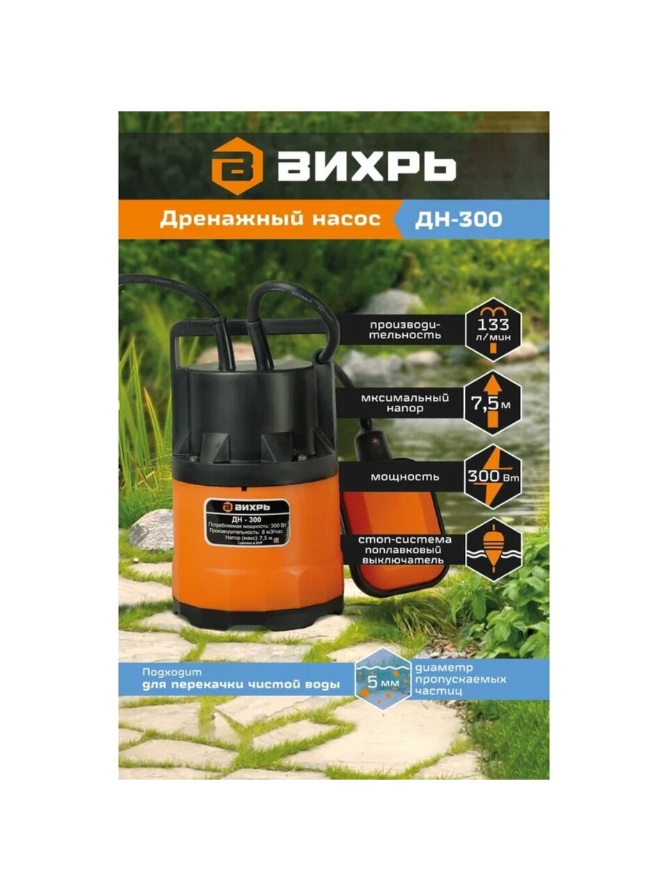 Дренажный насос Вихрь ДН-300 предназначен для перекачивания и отведения чистых, дренажных, дождевых и грунтовых вод. Допускается средний уровень загрязненности воды, наибольший размер твёрдых частиц не должен превышать 5 мм. Также насос можно использовать для подачи воды из открытых водоемов, колодцев и других источников. Изделие оснащено поплавковым выключателем, что позволяет насосу самостоятельно включаться по мере поступления воды и отключаться после ее перекачивания.