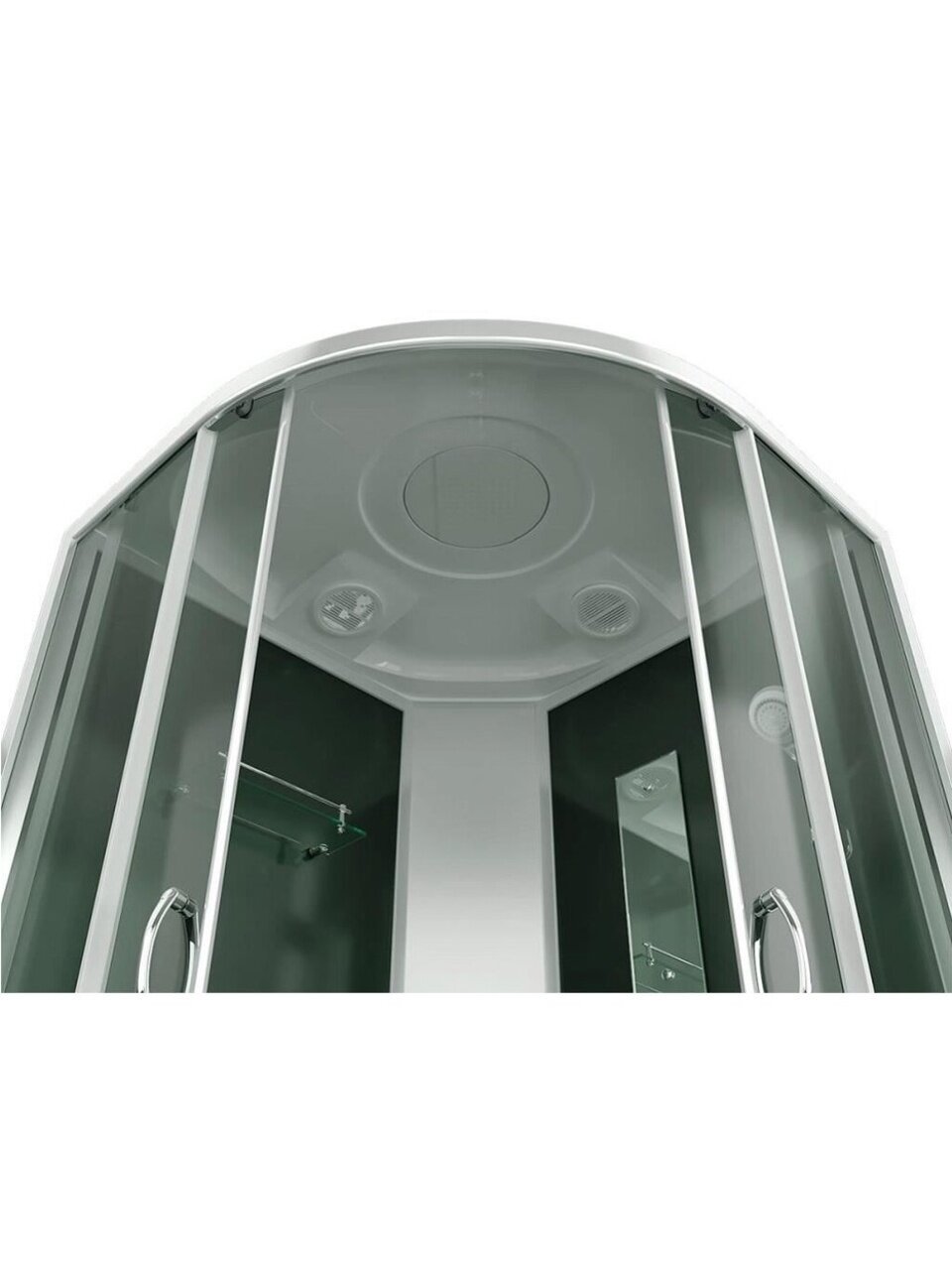 Кабина обладает высоким поддоном, сливное отверстие имеет увеличенный диаметр 6 см и обеспечивает хороший сток воды. Для комфорта пользователей внутри есть полочка и зеркало.