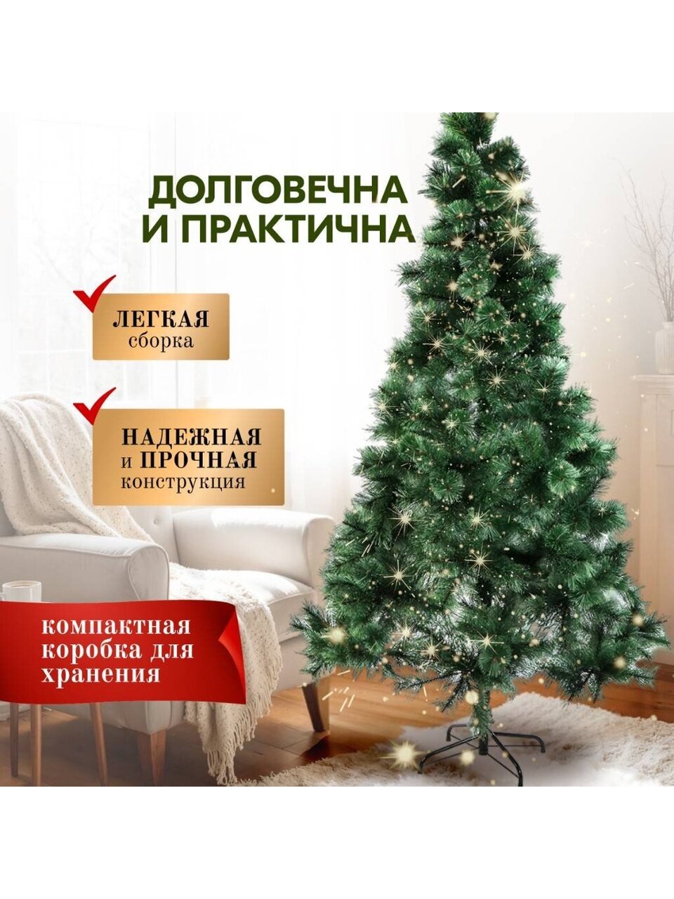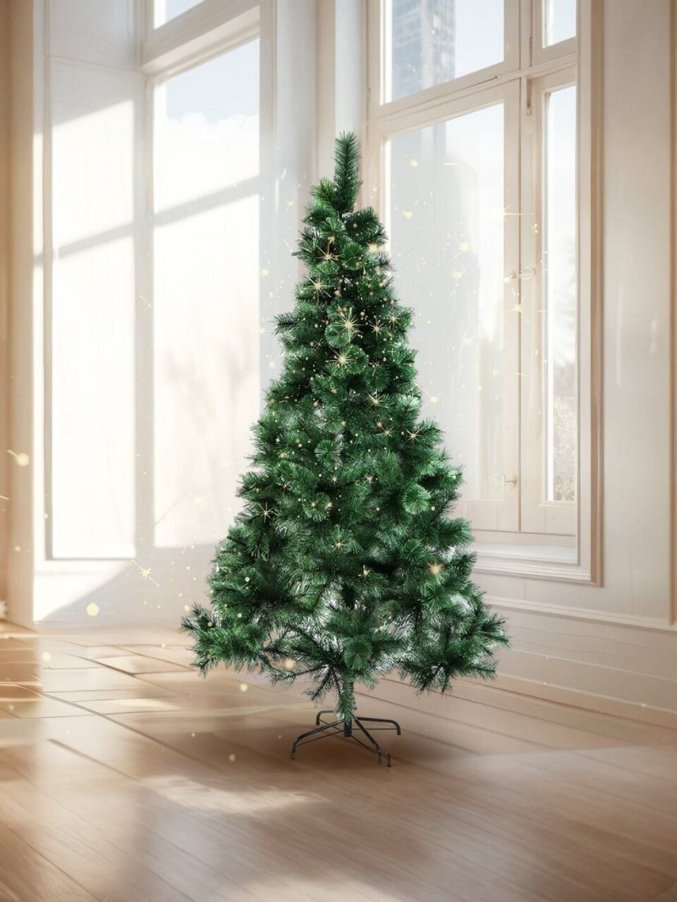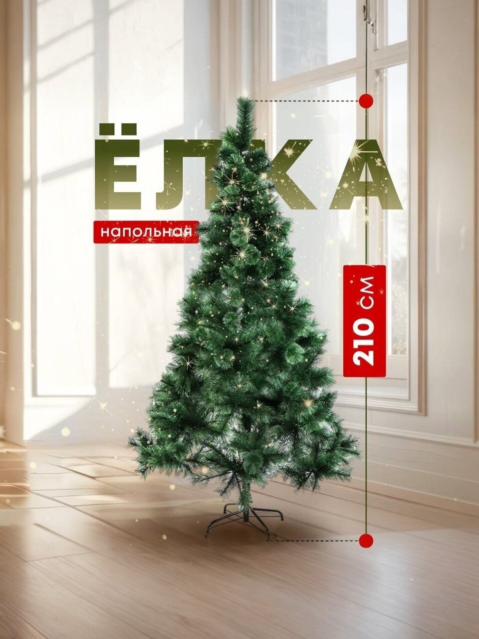 Елка новогодняя напольная 210 см «Мурманская» — эффектная сосна с густой хвоей-леской, устойчивая металлическая подставка, идеальный выбор для стильного праздника без лишних хлопот.