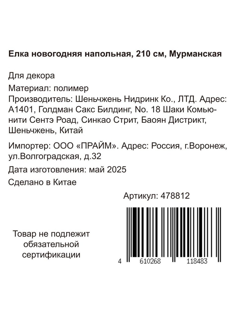 В отличие от аналогов на пластиковой подставке, модель Y4-8414 оснащена металлическим основанием — елка стоит надежно даже при активном декорировании. Как выбрать размер елки для комнаты? Высота 210 см — оптимальна для стандартных потолков (2,5–3 м), позволяет разместить игрушки и гирлянды любого размера. Искусственная сосна не вызывает аллергию и безопасна для детей и домашних животных. Подходит ли для подарка? Да, елка в компактной упаковке легко транспортируется и собирается за 10–15 минут.