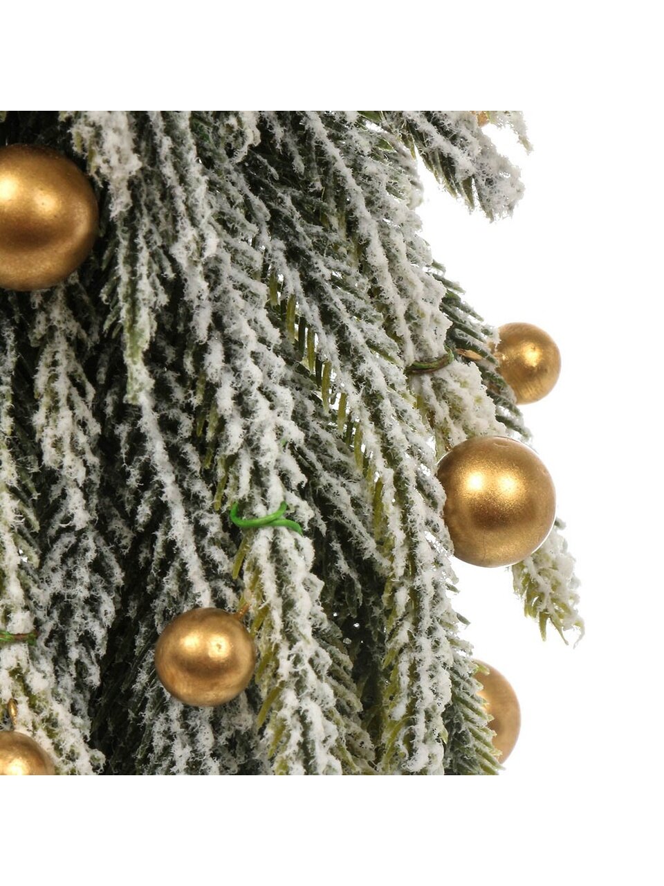 Хвоя выполнена из литого полимера, декор — искусственный снег и пластиковые шары. Елка не осыпается и не требует ухода.