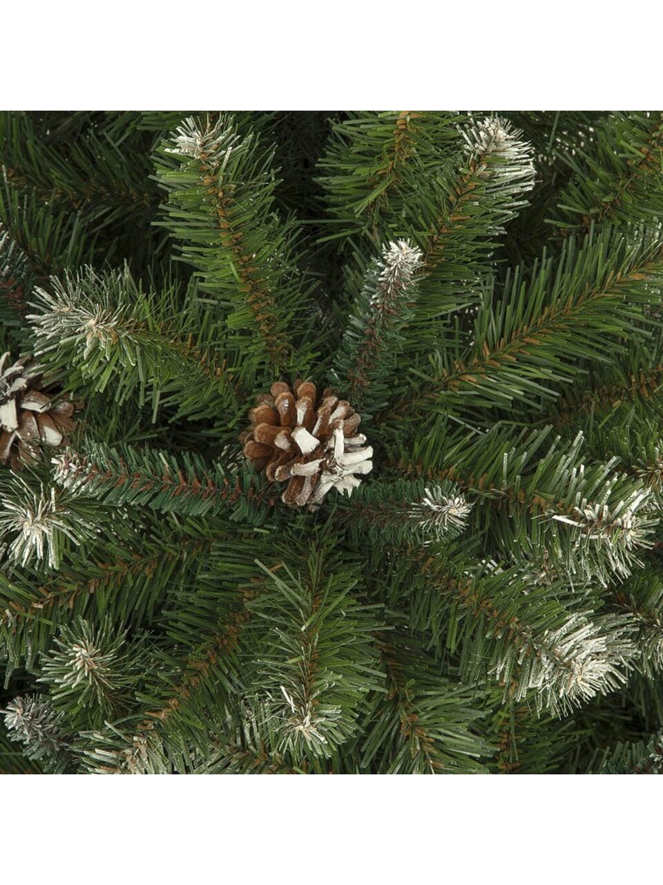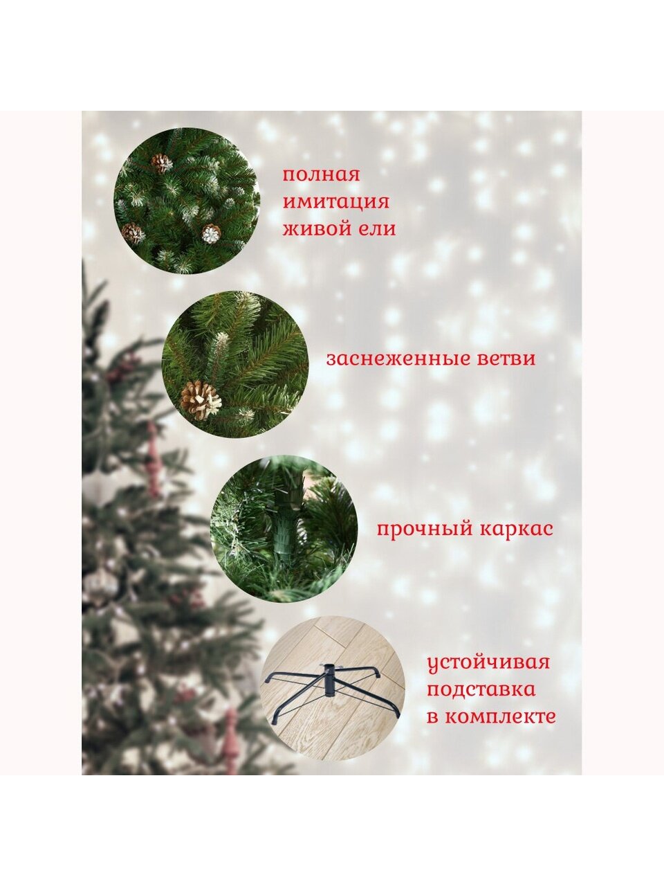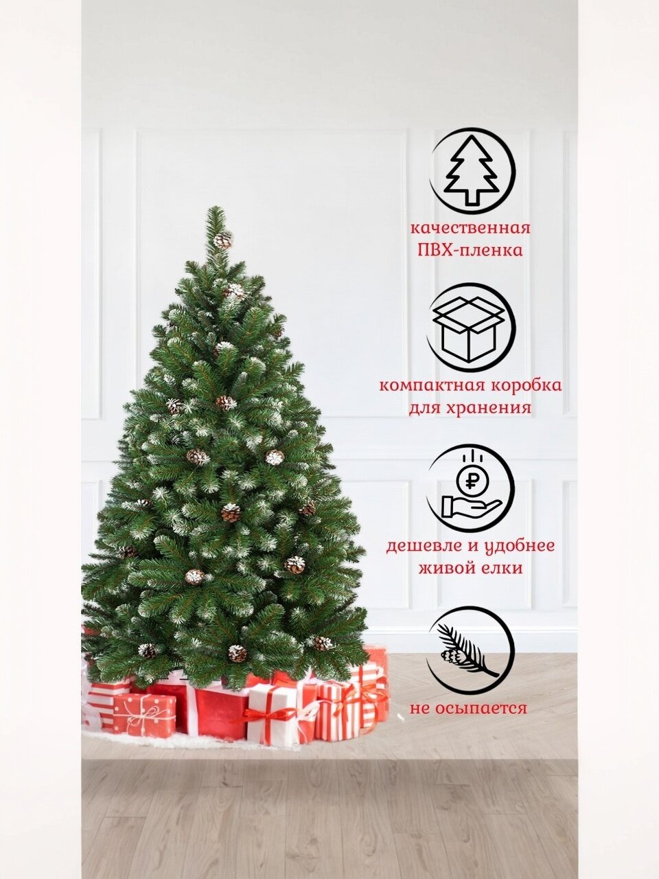 - Реалистичный заснеженный эффект и декор шишками — создаёт атмосферу зимней сказки без осыпания и запаха пластика