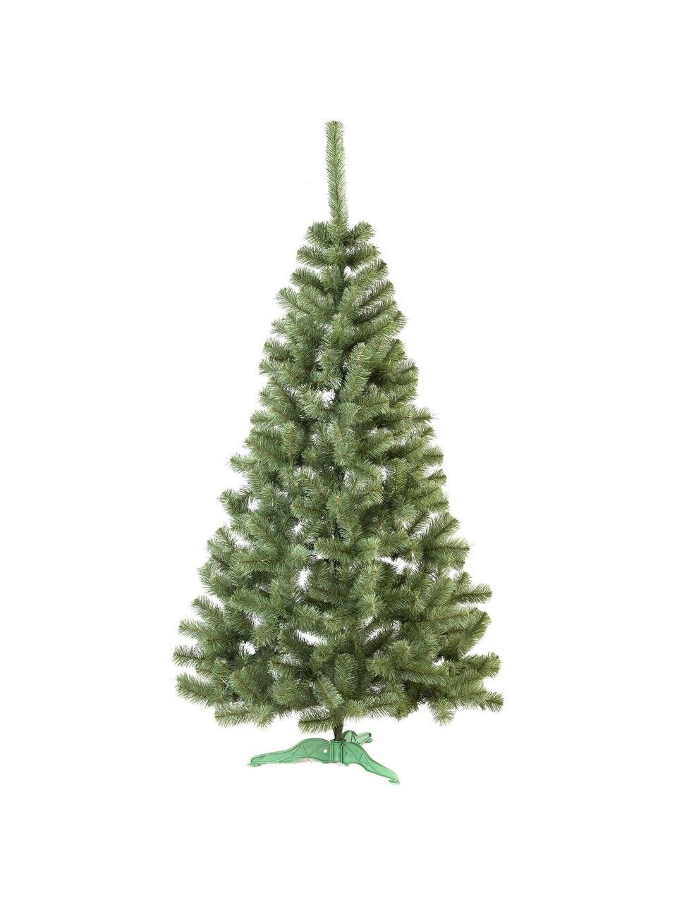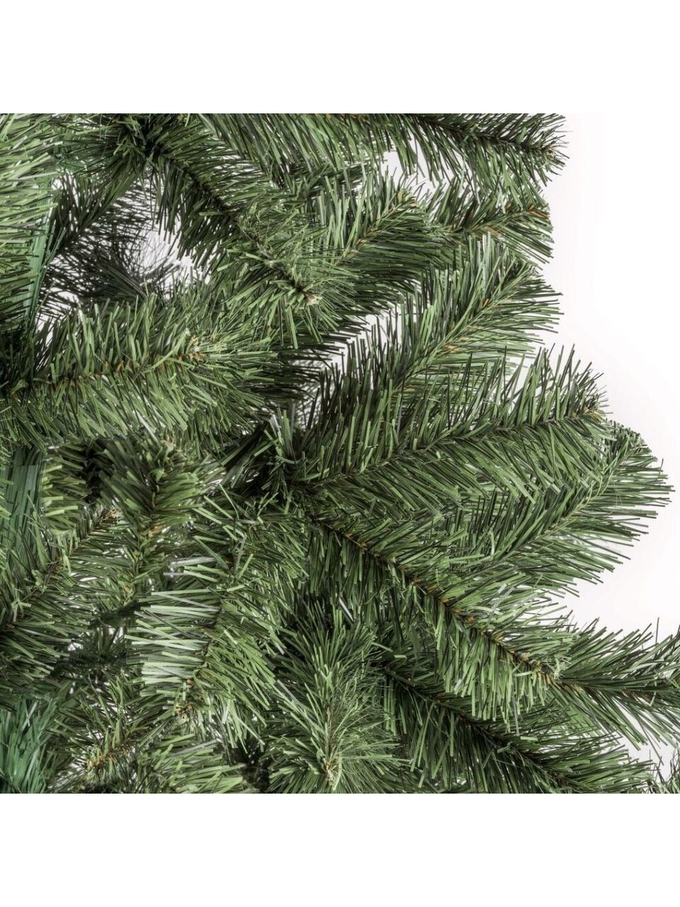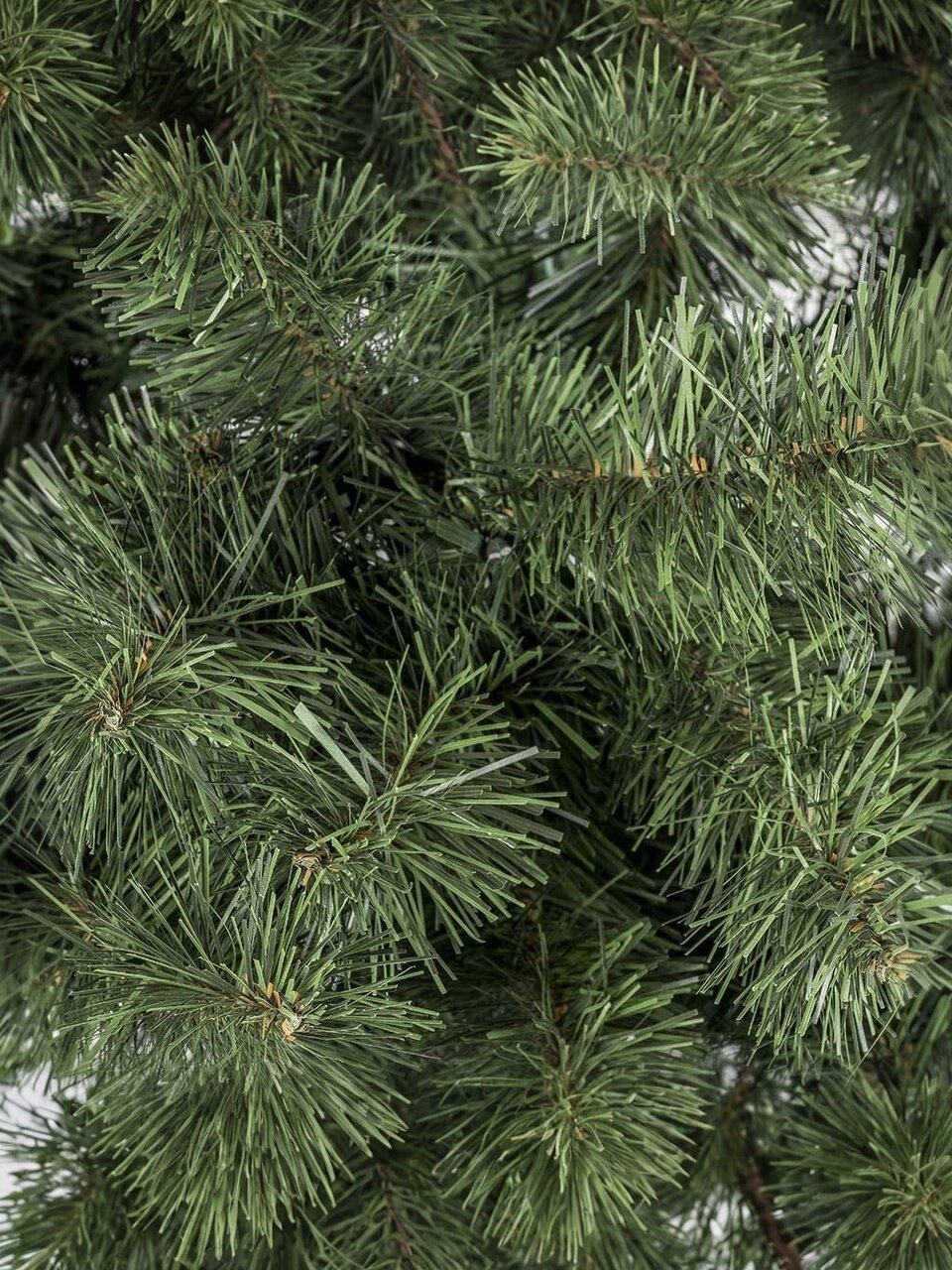 Высота — 220 см, диаметр — 115 см, хвоя выполнена из ПВХ-пленки, подставка — пластик, общее количество веток — 327, цвет — насыщенно-зеленый, форма — классическая.