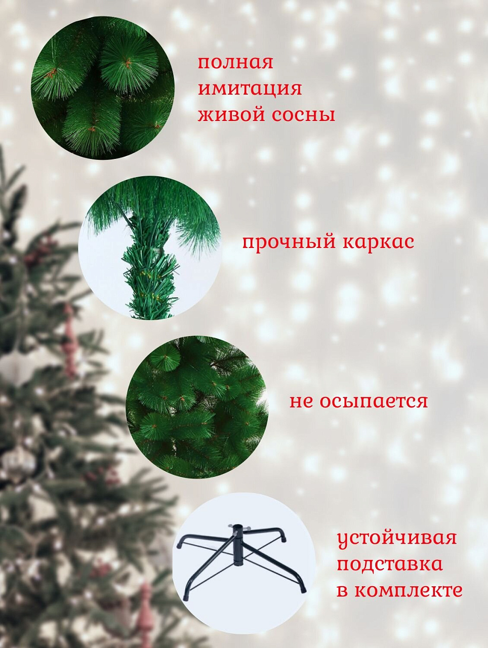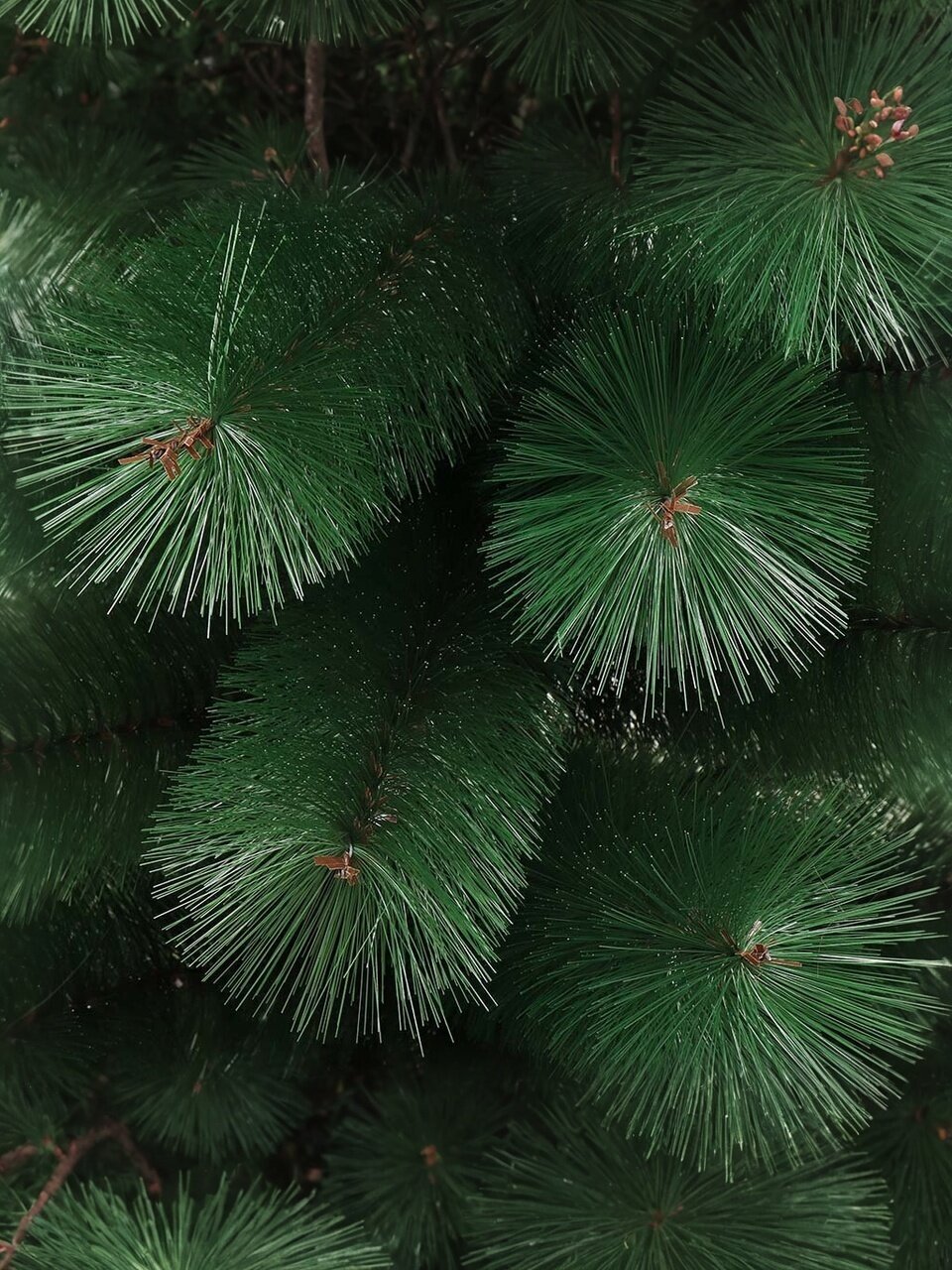 Густая крона с классическим силуэтом придает особый шарм, осталось добавить небольшое количество украшений и гирлянду. Короткая упругая хвоя "ершиком" этой изумительной елочки изготовлена из лески насыщенно зеленого цвета. Структура иголок по своему внешнему виду напоминает живую сосну. Материал абсолютно безопасен и позволяет создавать сосны, практически неотличимые от настоящих. Ветви модели отлично держат форму, не сминаются и не прогибаются под весом новогодних игрушек.
