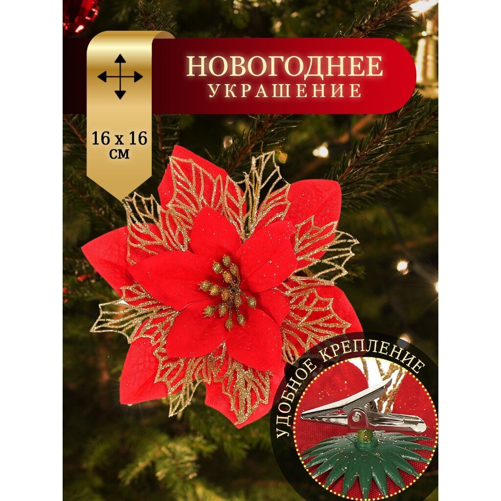 Елочное украшение Пуансеттия 16 см на прищепке: стильное решение для праздничного декора, небьющийся пластик, эффект красного золота, быстрое крепление.
