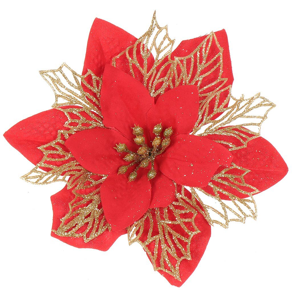 Цветок пуансеттии красного золота, диаметр 16 см, крепление — металлическая прищепка, материал — долговечный пластик.
