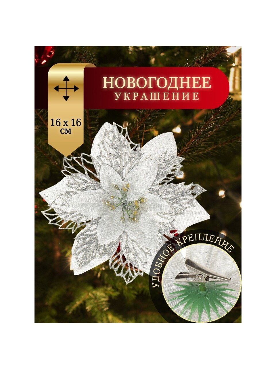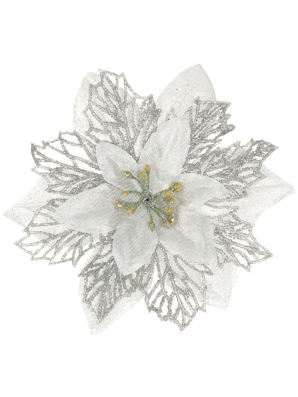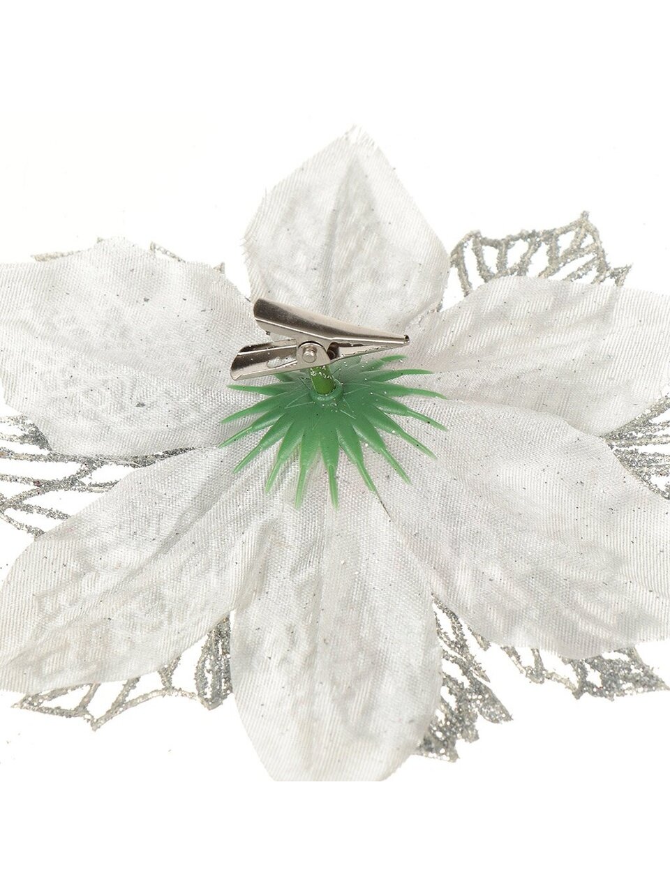 Елочное украшение Пуансеттия серебро 16 см на прищепке — стильный акцент для новогодней елки, который не разобьется и легко крепится даже на уличные ветки.