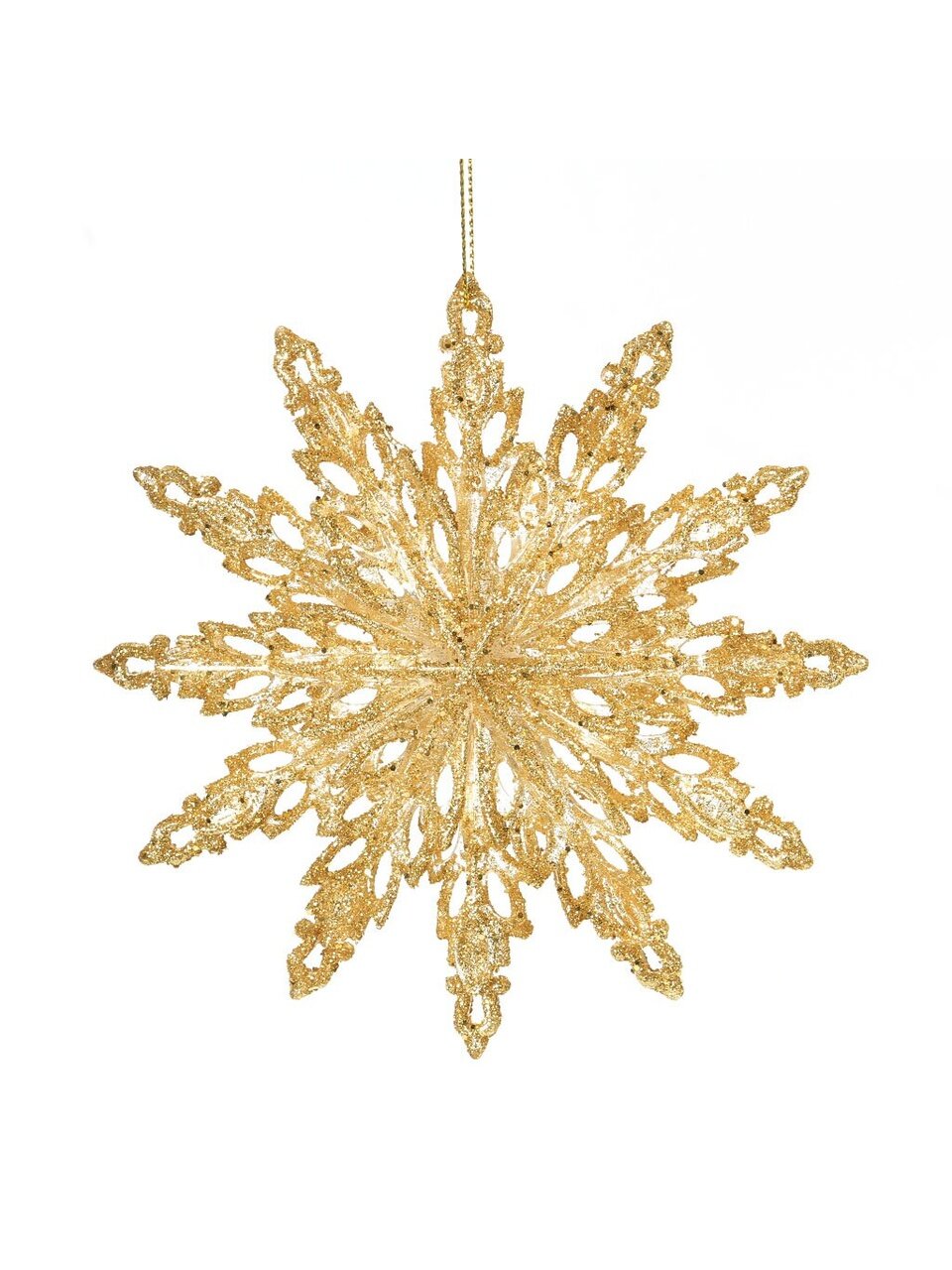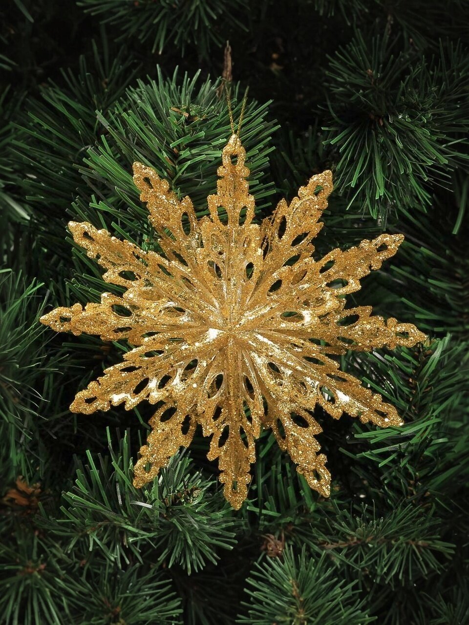 Золотая елочная снежинка 7,5 см: стильный акцент для новогодней елки дома и на улице, не бьется, эффектное блестящее покрытие, выгодная цена.