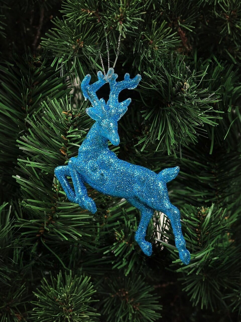 - Уникальный дизайн: однотонный голубой олень с мерцающими блестками, который выделяется на фоне других украшений