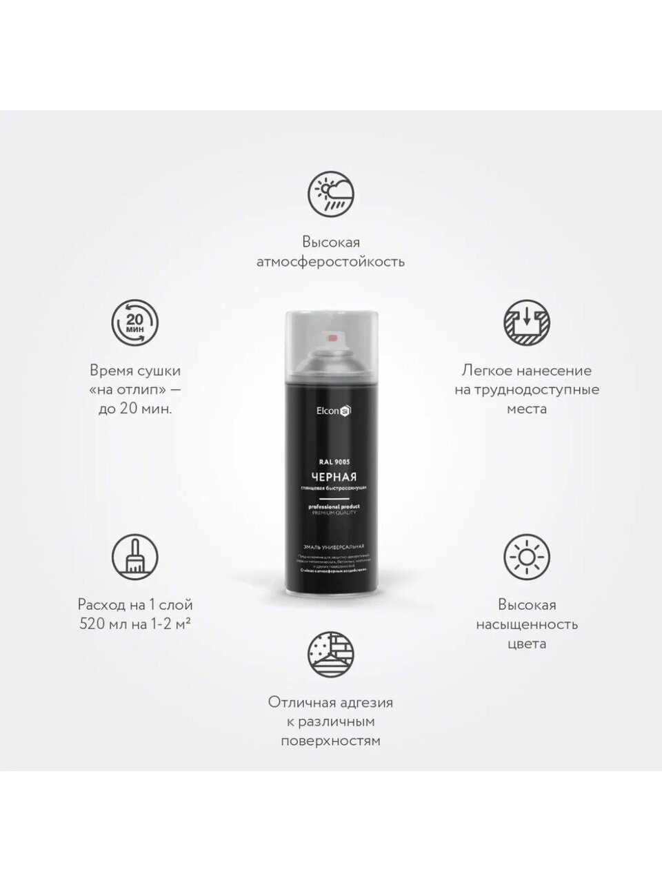 Вы можете приобрести «Эмаль аэрозольная, Elcon, универсальная, быстросохнущая, акриловая, глянцевая, черная, RAL 9005, 520 мл» и другие товары в нашем интернет-магазине в Ярославле по низким ценам и с бесплатным самовывозом.