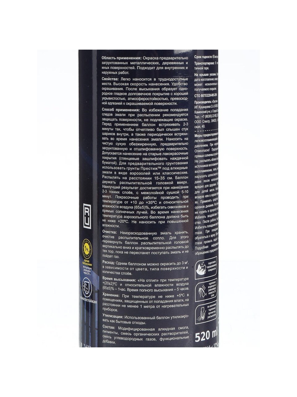 - Удобный формат — аэрозоль 520 мл, однокомпонентный состав, легко наносится на металл и дерево.
