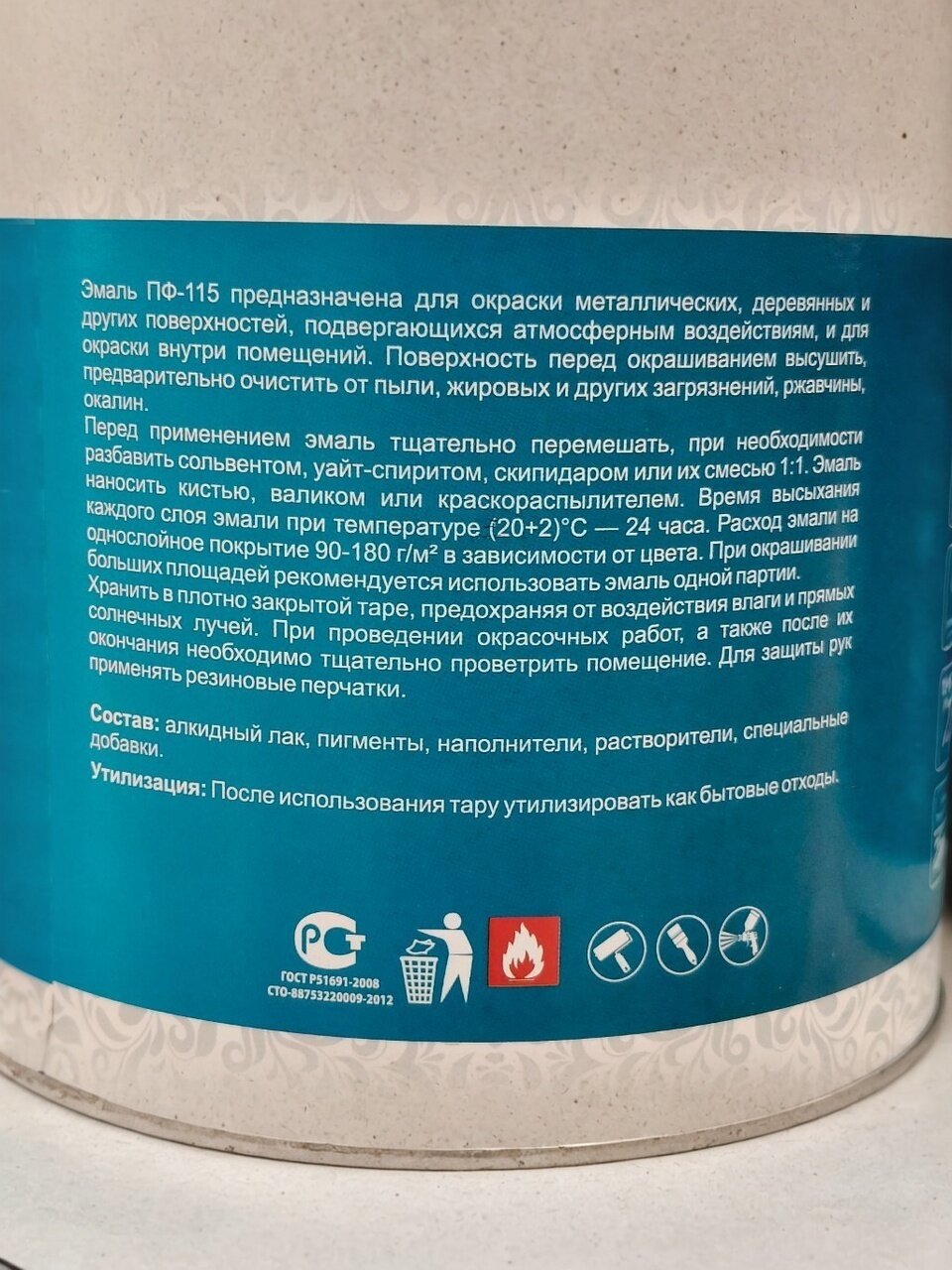 Эмаль ПФ-115 предназначена для окраски металлических, деревянных и других поверхностей, подвергающихся атмосферным воздействиям, и для окраски внутри помещений. Поверхность перед окрашиванием высушить, предварительно очистить от пыли, жировых и других загрязнений, ржавчины окалин.