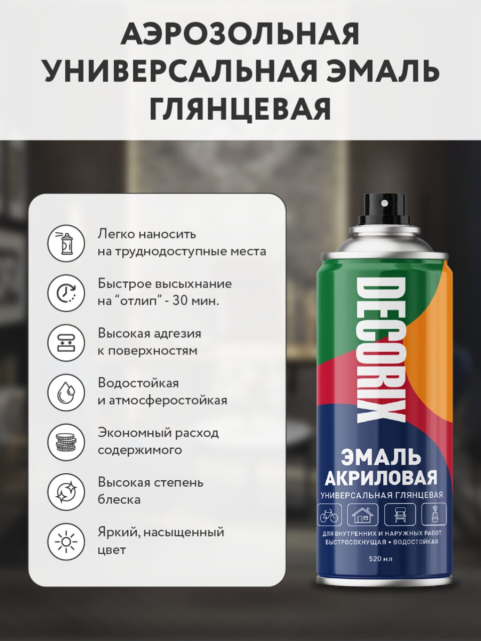 Высококачественная универсальная акриловая глянцевая эмаль DECORIX используется в декоративно-оформительских работах, строительстве и ремонте.