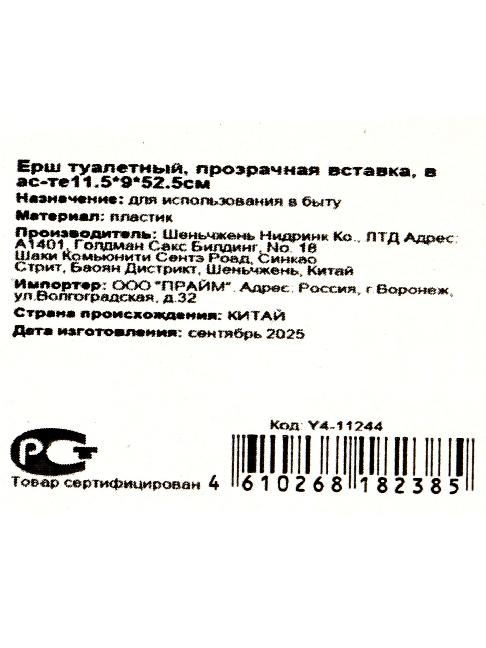Размер ерша: длина 11,5 см, ширина 9 см, высота 52,5 см. Подходит для стандартных и компактных санузлов.