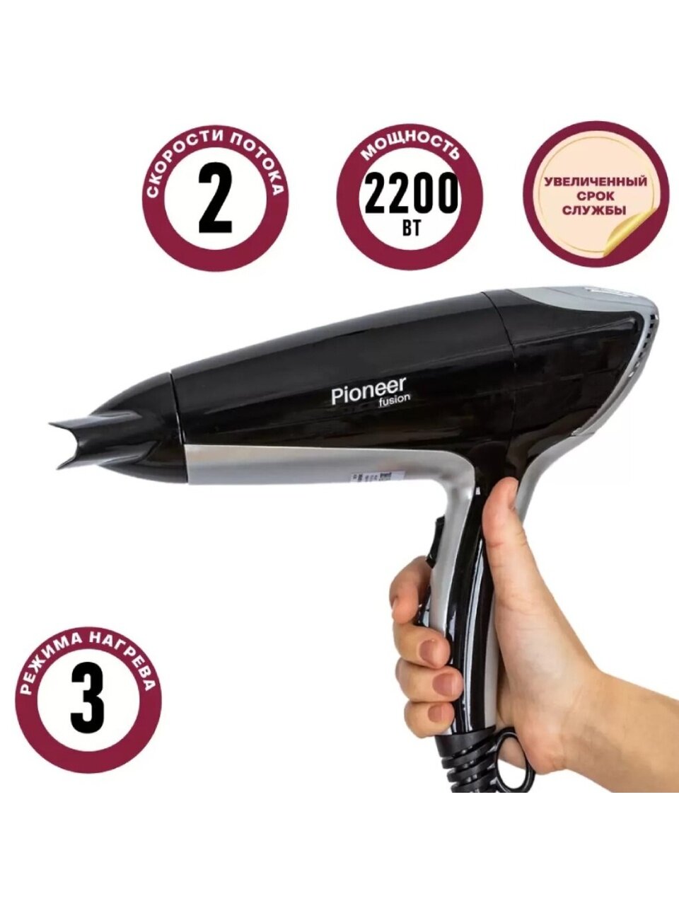 - Мощный фен Pioneer HD-2201DC с турмалиновой ионизацией поможет вам существенно сократить время на укладку и забыть о проблеме электризации волос;