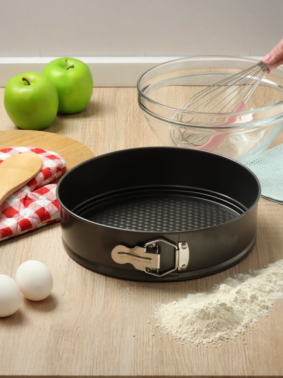 - Разъемная круглая форма с антипригарным покрытием — легко извлекать выпечку без повреждений