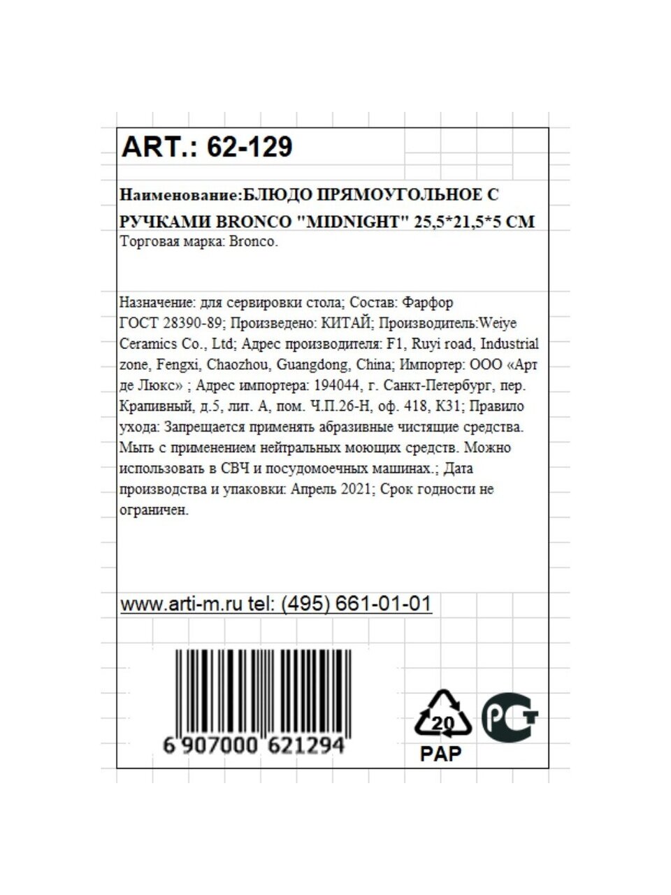 Вы можете приобрести «Форма для запекания фарфор, 21.5х25.5х5 см, 1 л, прямоугольная, с ручками, Bronco, Midnight, 62-129» и другие товары в нашем интернет-магазине в Курске по низким ценам и с бесплатным самовывозом.