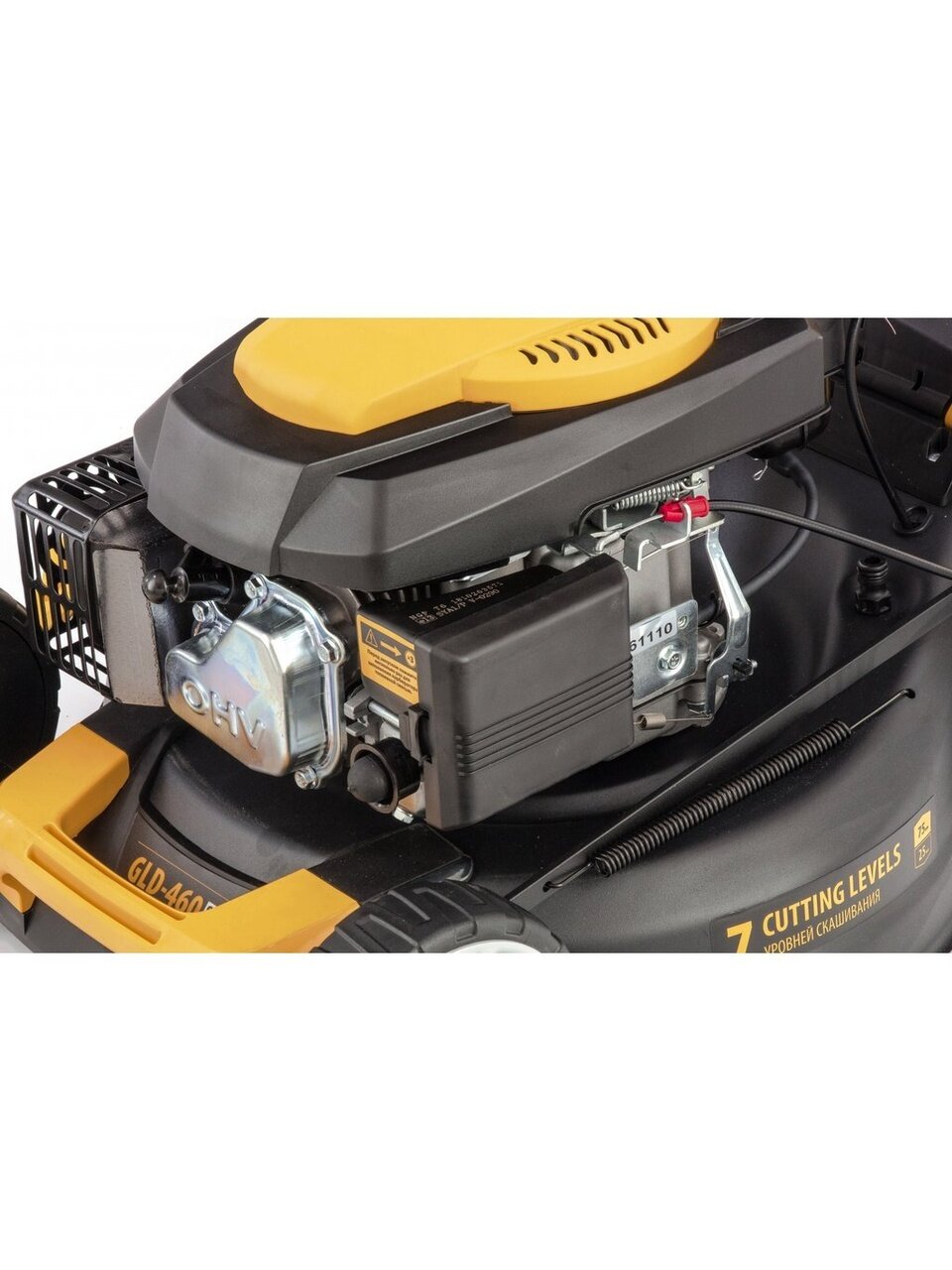 - Газонокосилка GLD-460SP удобна в обслуживании и хранении. Чтобы завершить сезон кошения, достаточно смыть водой грязь и остатки травы с внешних элементов. Очистить внутреннюю полость деки позволит специальный штуцер. Для компактного хранения можно сложить ручку и убрать изделие до следующего сезона.