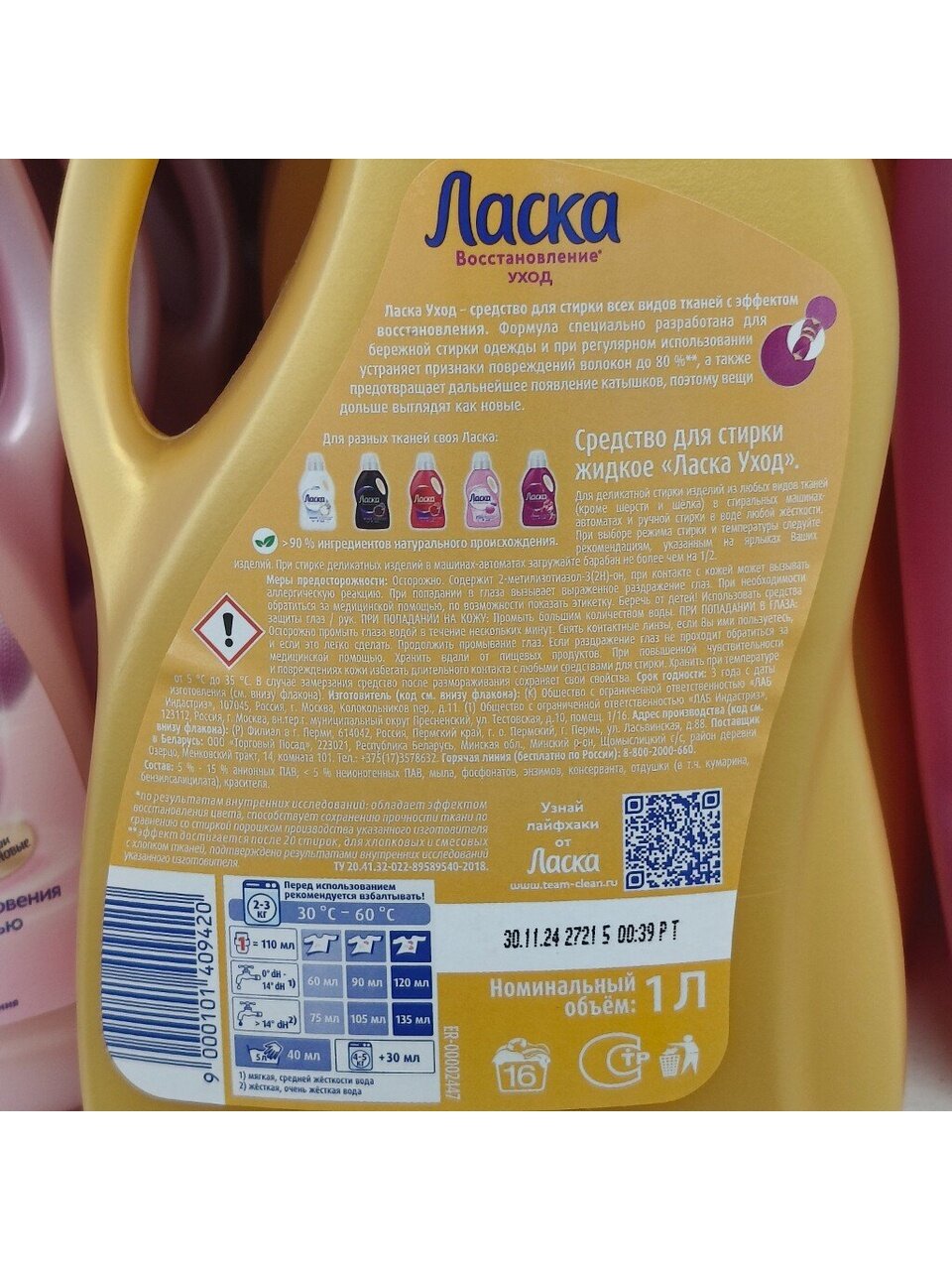 - Средство Ласка деликатно ухаживает за тканью, не разрушает волокна, сохраняя мягкость вещей.