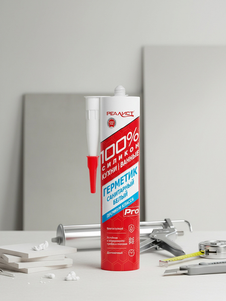 Санитарный силиконовый герметик Realist Pro 280 мл — надежная защита от плесени и влаги для ванной и бассейна. Долговечность, химстойкость, белоснежный шов.