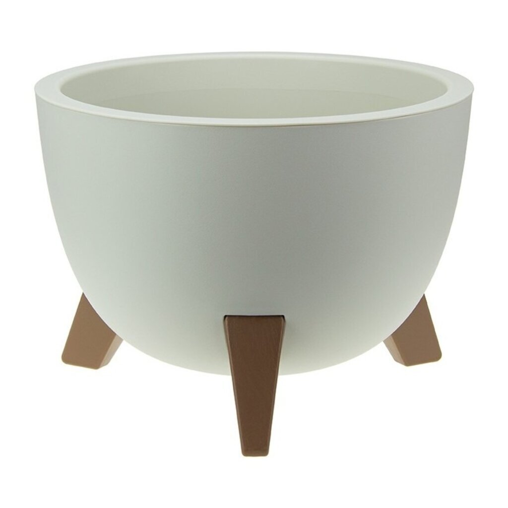 Кашпо со вставкой на ножках имеет круглую форму и матовую поверхность.