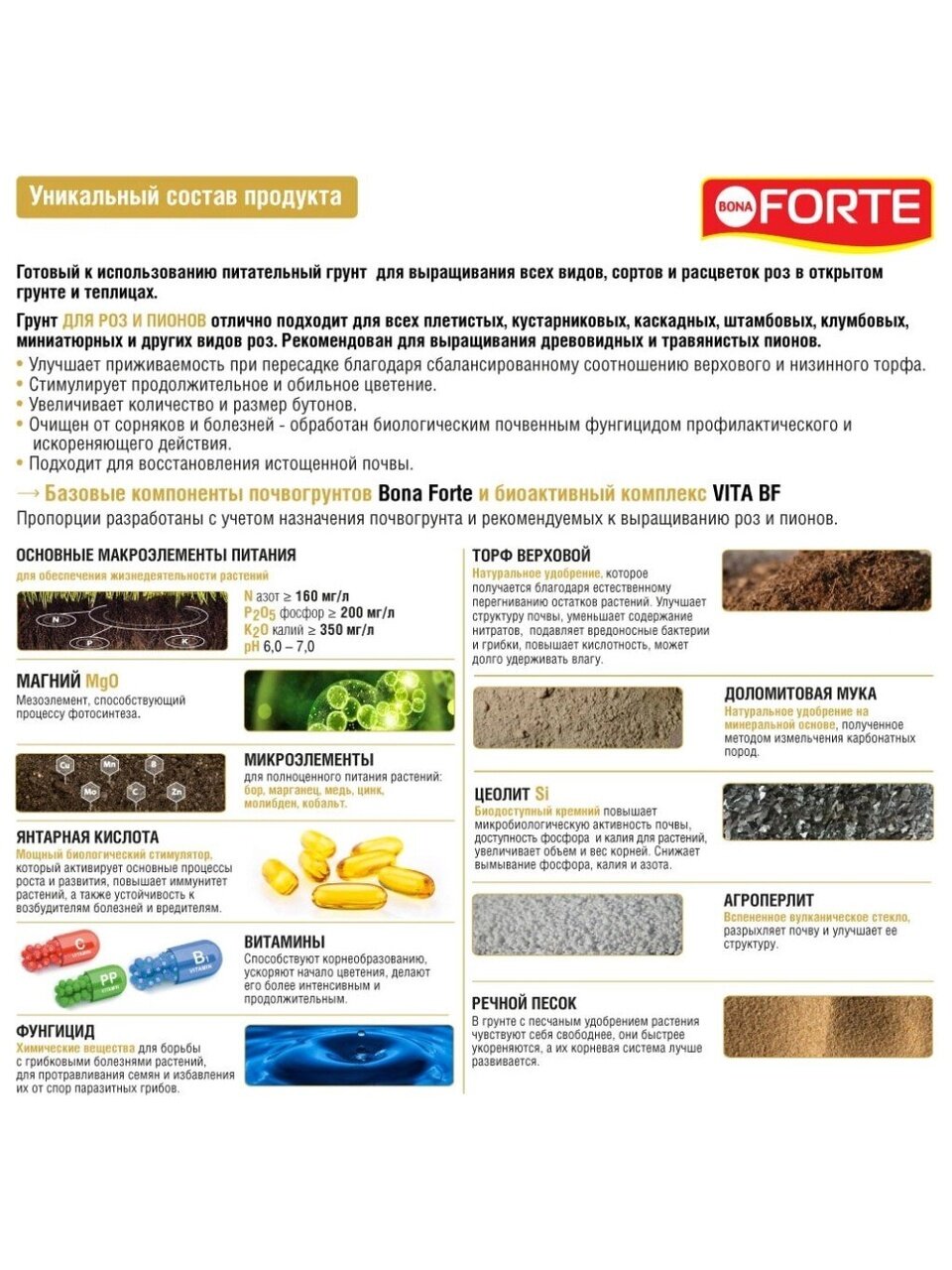 Грунт Bona Forte для роз и пионов 10л BF29010111 — идеальное решение для тех, кто ценит красоту и здоровье своих цветов. Специально разработанная формула обеспечивает полноценное питание, активное развитие и обильное цветение роз и пионов разных видов. Универсальный состав подходит для всех плетистых, кустарниковых, каскадных, штамбовых, клумбовых, миниатюрных и других видов роз, а также рекомендован для выращивания древовидных и травянистых пионов. Благодаря тщательно подобранным компонентам, грунт помогает создать оптимальные условия для роста и стимулирует активное корнеобразование.