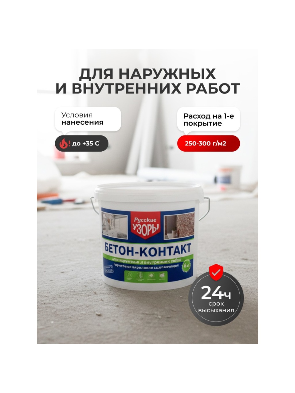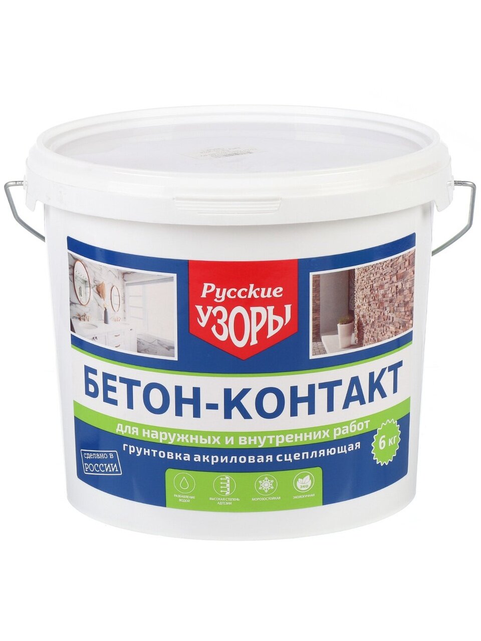 Грунтовка для наружных и внутренних работ на основе акриловых полимеров Русские узоры - готовая к применению адгезионная грунтовка для работ по бетону. Можно использовать между слоями бетона. За счет объемного наполнителя, после высыхания, создает шероховатую поверхность, чтобы на бетон можно было наносить последующую отделку. Используется перед нанесением штукатурок и шпатлевок на цементной и гипсовой основах, плиточного клея.