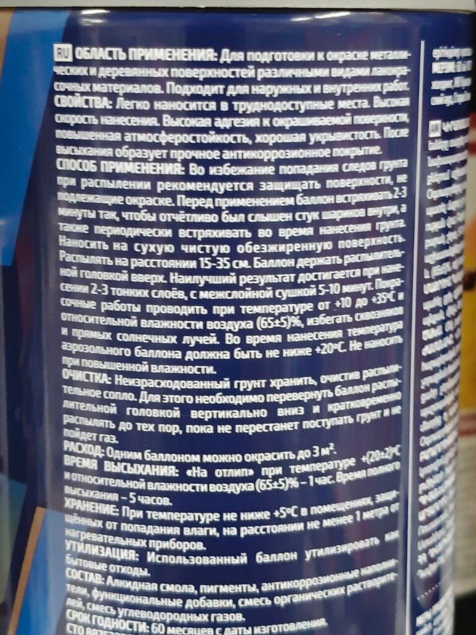 Применение: Во избежание попадания следов грунта при распылении рекомендуется защищать поверхности, не подлежащие окраске. Перед применением баллон встряхивать 2-3 минуты так, чтобы отчетливо был слышен стук шариков внутри, а также периодически встряхивать во время нанесения продукта. Наносить на сухую чистую обезжиренную поверхность. Распылять на расстоянии 15-35 см. Баллон держать распылительной головкой вверх. Наилучший результат достигается при нанесении 2-3 тонких слоёв, с межслойной сушкой 5-10 минут. Покрасочные работы проводить при температуре от +10 до +35ºС и относительной влажности воздуха (65±5)%, избегать сквозняков и прямых солнечных лучей. Во время нанесения температура аэрозольного баллона должна быть не ниже +20ºС. Не наносить при повышенной влажности.